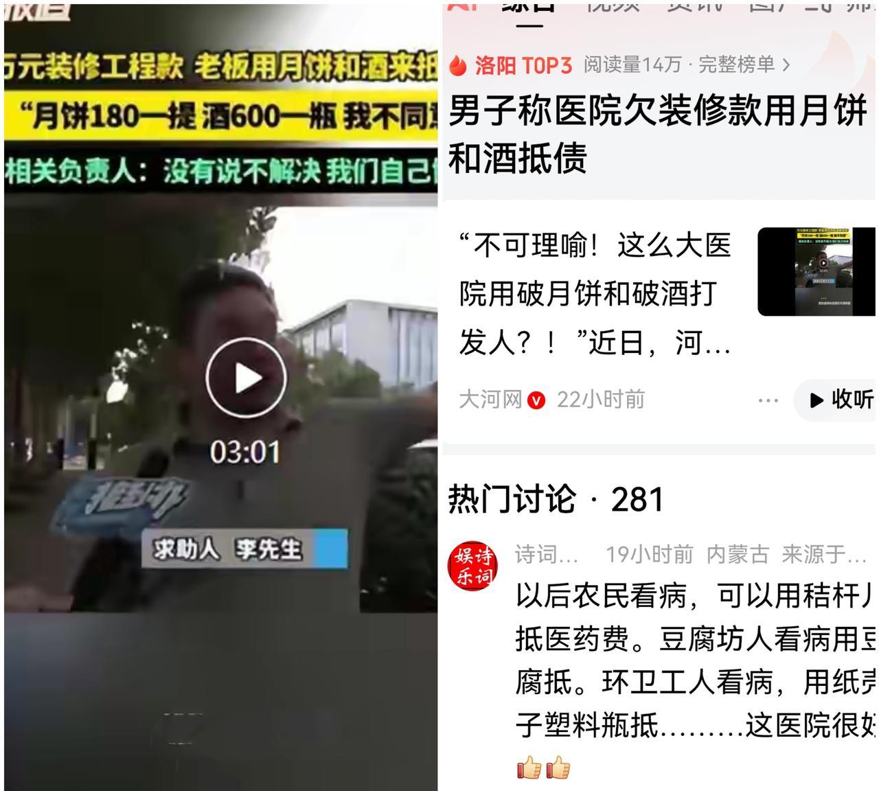 医院用月饼和白酒顶装修款项,说不好听就是光天化日之下耍流氓! 见过脸皮厚的,还真没见过脸皮比城墙还厚的,洛阳搞装修的李先生就遇见了。 他给当地某家医院(洛阳曙光中医院)做装修,装修都结束一年了,可区区14730元装修款,却一直要不来,因为啥时候问了都是“没钱”俩字。 呵呵,然而中秋佳节临近,欠债拖欠不还的该医院,竟然提出要用月饼和酒抵债。 尽管既非名牌白酒也不是名牌月饼,居然给李先生上了个难以接受的高价(白酒要600元一瓶,月饼要180元一提)。 试想一下,若该医院顶账的小众白酒成本只有几十元一瓶,月饼只要几十元一盒,那么李先生应收的欠款岂不大大缩水了吗? 所以毫不夸张地讲,欠债的医院用月饼和白酒顶人家装修款项,说不好听就是光天化日之下欺负人“耍流氓”。 其实,这种以次充好,用一般白酒和月饼等物品顶账的事件并不罕见。 霍小姐一位搞工程的朋友,去年底去项目部结账,就意外收获了满满一车定制白酒。你如果不要这高价白酒(500元一瓶),一分钱也没有。 无奈之下,搞工程的朋友只好极不情愿地收下顶账的高价白酒。 希望有关部门制定个规矩出来,欠账就要用真金白银来偿还,严禁用以次充好的白酒和月饼等物顶账。 对此,大伙怎么看?请评论区里发表你的高见。 #医院欺民# #医院装饰施工#