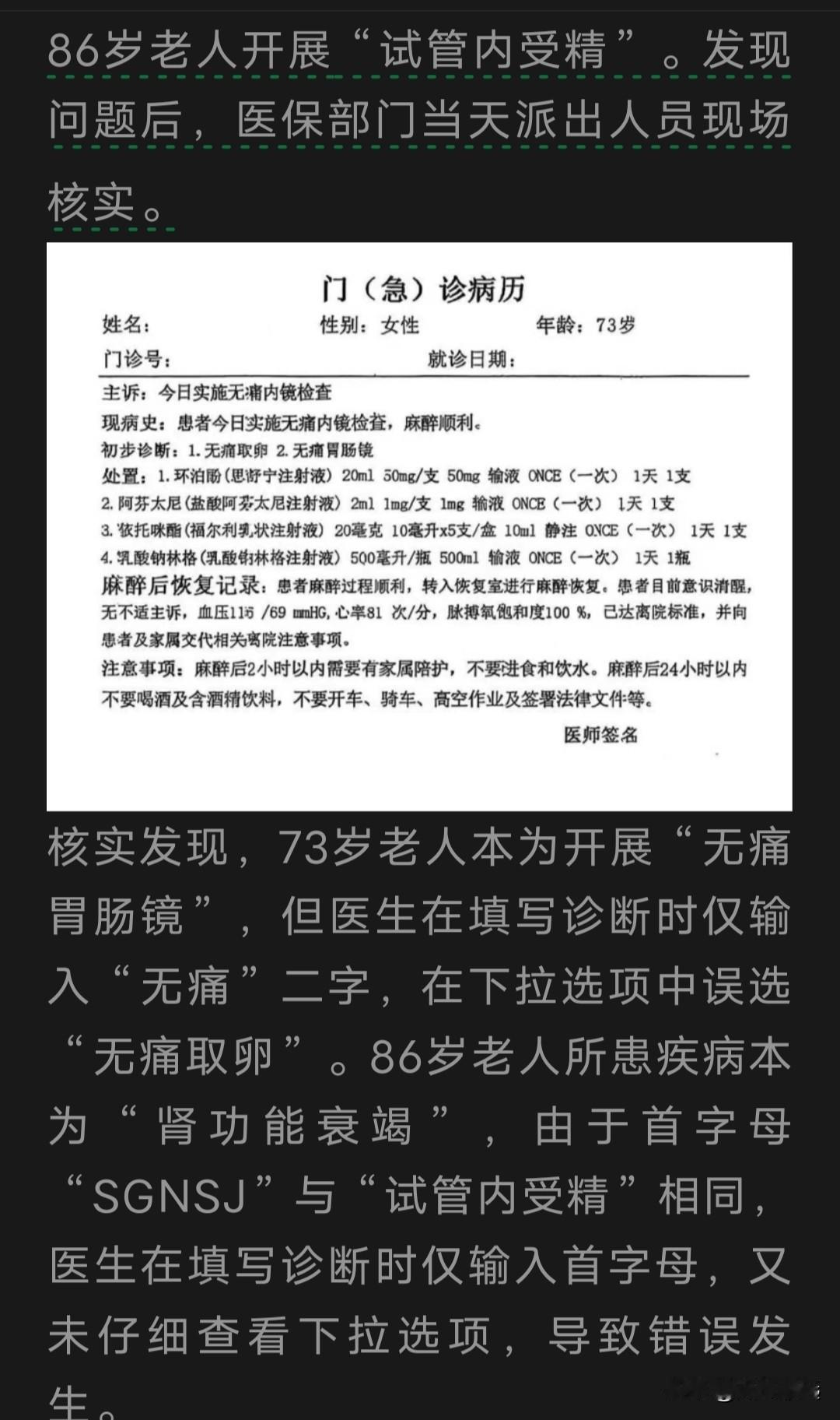 真就这么巧[捂脸] “肾功能衰竭”,首字母“SGNSJ”与“试管内受精”相同。 86岁老人所患疾病本为“肾功能衰竭”,医生在填写诊断时仅输入首字母,又未仔细查看下拉选项,导致老人“试管内受精”发生。 这事惊动了国家医保局,调查后才发现是乌龙。