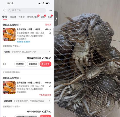 “我明明买的是全母蟹,收到的却是一半公一半母!”来自河北秦皇岛的王先生向“人民投诉”平台记者展示了他的订单截图和实物照片。9月17日,他在短视频平台商城下单了两单标注为“全母蟹”的商品,收到货后却发现每份都是公母掺半。