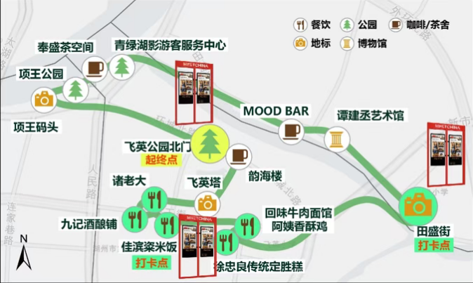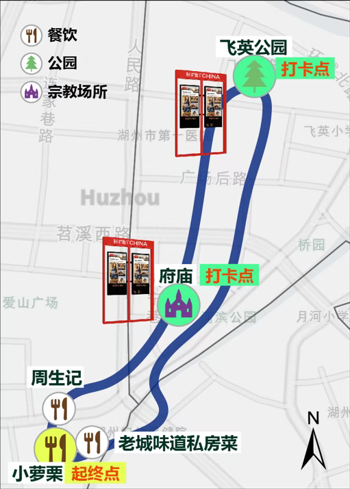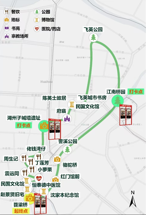 北片区,白天2小时,老城漫游线,共设15个点位,如飞英公园、飞英塔、谭建丞艺术馆、项王公园、项王码头,串联起湖州最具代表性的古迹与文化场所;美食点位则覆盖诸老大、九记酒酿铺、佳滨粢米饭、徐忠良定胜糕、阿姨香酥鸡等老字号与地道小吃;晚上3小时,市井沉浸线,5个主要点位,田盛街的灯火与小吃,旅行的故事餐吧的休憩氛围,奉盛茶空间的宋代点茶体验,以及项王码头的琵琶演奏与水幕光影表演,最后回到飞英公园北门。