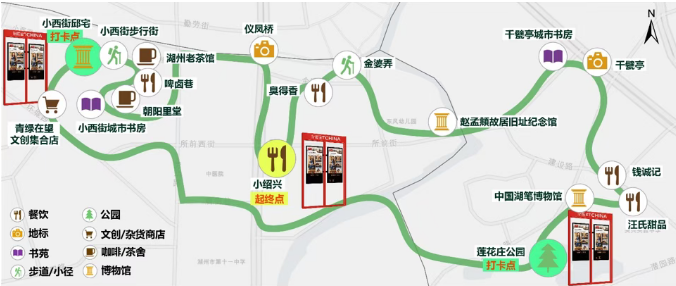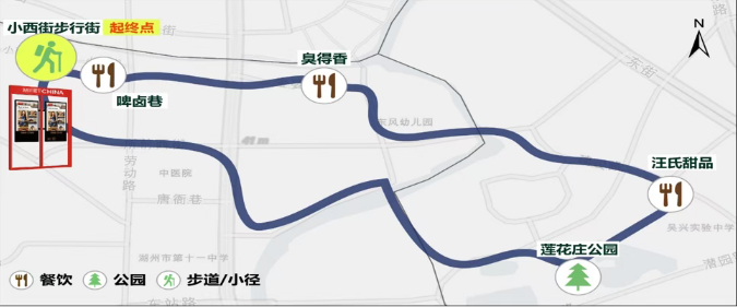 南片区,白天2小时,共设19个点位,串联了小西街邱宅、小西街城市书房、中国湖笔博物馆、莲花庄公园等文艺与文化空间,形成“文创—古建—书房—博物馆—园林”的叙事链条,行程中穿插小绍兴、臭得香、钱诚记、汪氏甜品等湖州经典餐饮点位;夜晚3小时,以小西街步行街为起点,串联啤卤巷、臭得香、汪氏甜品,最后抵达莲花庄公园。