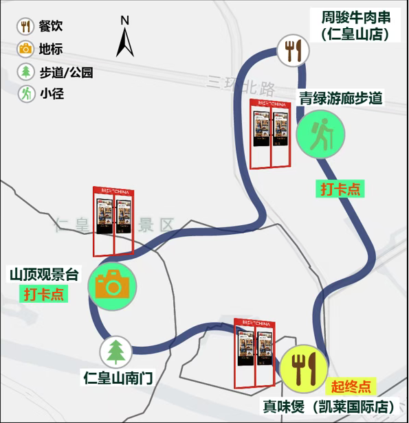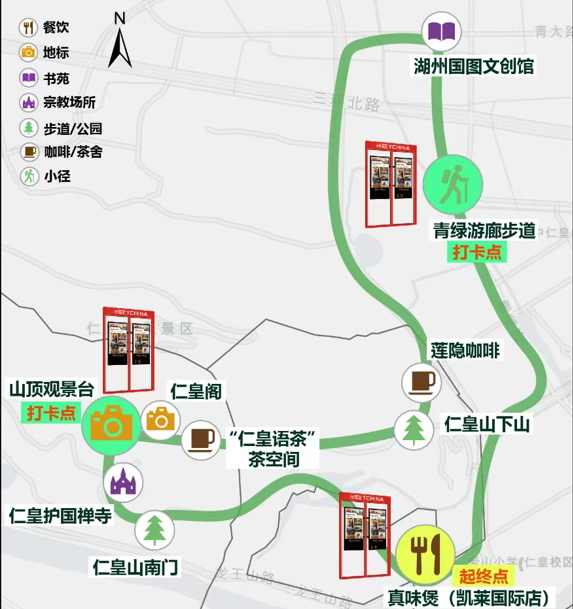 西片区,白天2小时,主打生态江南体验线,整条线路共设10个点位(含起终点重合),以真味煲(凯莱国际店)为出发点与终点,沿途经过仁皇山南门登山口、仁皇护国禅寺、山顶观景台、仁皇阁、“仁皇语茶”茶空间、国图文创馆(湖州)、青绿游廊步道等;晚上3小时,江南沉浸线,串联5个点位,从真味煲(凯莱国际店)出发,在夕阳余晖中缓步登山,山顶观景台可欣赏太湖与湖州城市的光影交融,18:00看城市灯光秀,下山后抵达周骏牛肉串(仁皇山店),体验湖州市井夜生活,品尝新鲜牛肉串再喝口啤酒,享受这份夜食惬意,最后经青绿游廊步道,在光影投射与AR互动中完成行程。