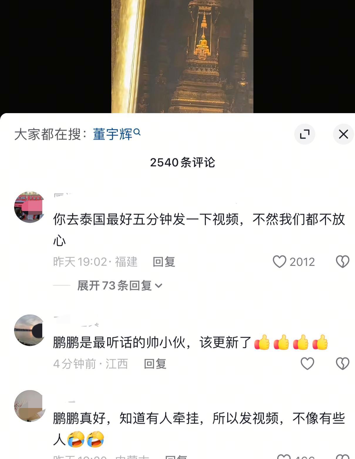 鹏鹏国庆休假去泰国玩儿 这可把粉丝们担心坏了 让他五分钟报备一次[笑哭] 万一有安全隐患也好及时报警[捂脸] 鹏鹏不听话,今天下午才发了第二条视频 热的头发都汗湿了还滴进了眼睛里 还得抽空拍视频给大家报平安[大笑] 鹏鹏啊,你看看你选的这地儿 怪不得大家担心你呢 不过还是获得了一致赞扬 虽然一天发一条 最起码人家发了 自己也出镜了 不像他哥 至今没有丝毫动静[笑哭]