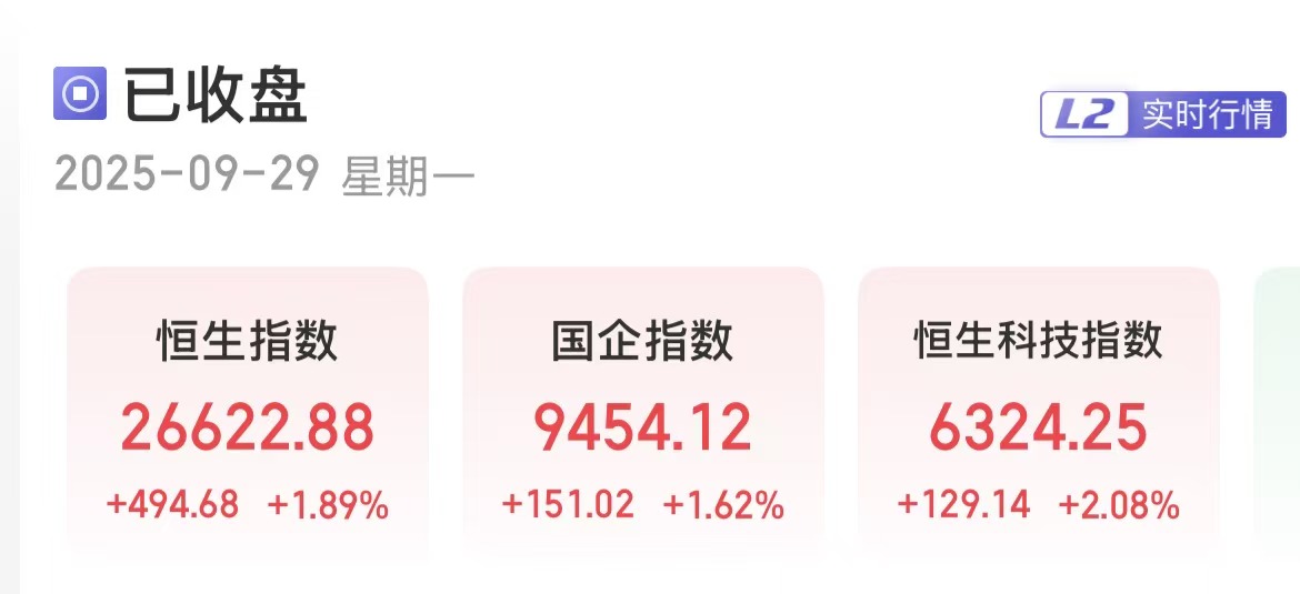 上证报中国证券网讯(刘禹希记者严晓菲)9月29日,港股三大指数集体走强。截至收盘,恒生指数涨1.89%,报26622.88点;恒生国企指数涨1.62%,报9454.12点;恒生科技指数涨2.08%,报6324.25点。