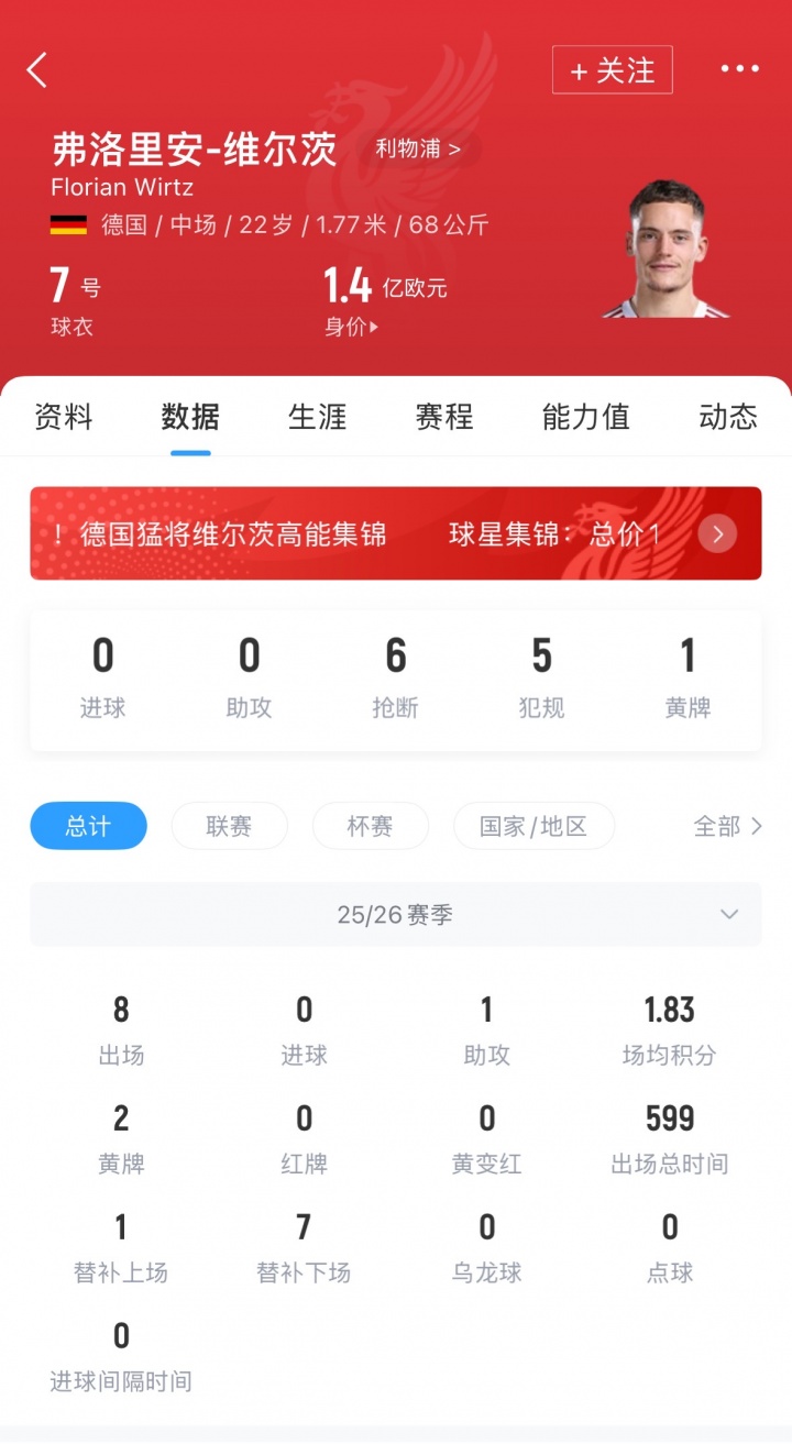 直播吧09月29日讯知名转会记者罗马诺更新个人youtube频道,谈到了近期维尔茨的表现以及利物浦对球员的看法,表示红军仍然对维尔茨抱有信心。