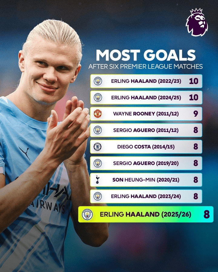 挪威前锋在22/23赛季、24/25赛季都创造过前六轮打进10球的战绩,而最“糟糕”的成绩,是在23/24赛季和本赛季的前六轮8球。