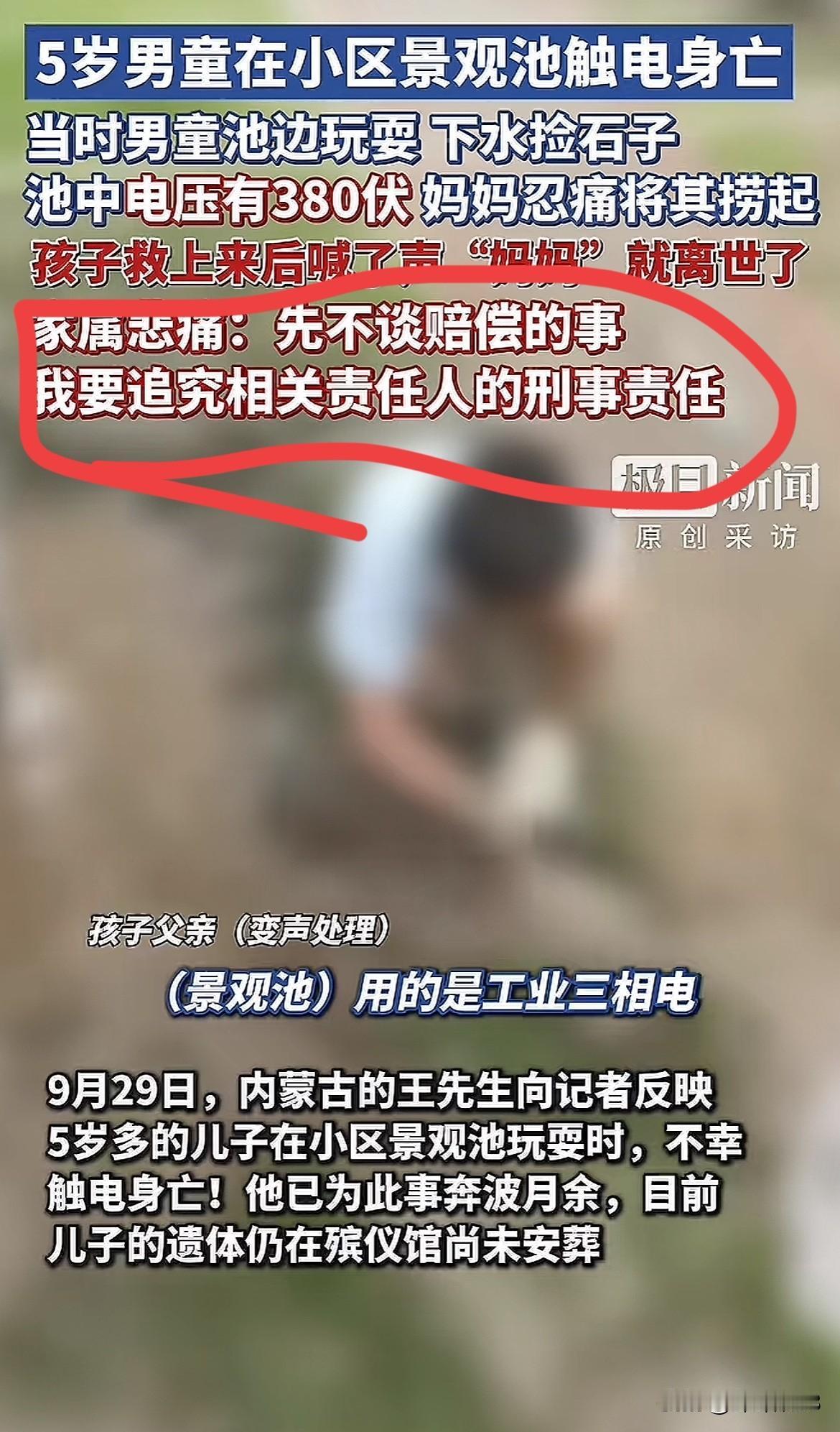 这个消息真的令人悲痛万分,一声妈妈后就阴阳相隔了…… 事发时景观池边一群小朋友往池中扔石头玩,只有这个五岁的小男孩自己下去捡石头,因为他触到水,水有电,所以就趴小水池里了,随后她的妈妈去拉他,妈妈也感觉到刺痛,才发现触电了,哎,抱起来后他就只喊了一声妈妈就离世了~ 听他爸爸说这个小区存在违规,应该是没有漏电保护,而且使用的是380伏的高压电!必死无疑啊!负责人要倒霉了…… 意外