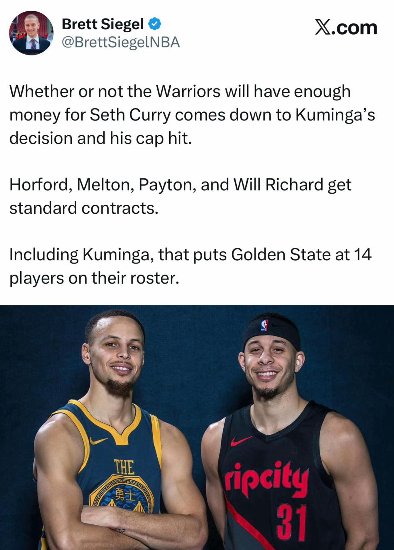 Brett Siegel:勇士是否有足够资金签下塞斯-库里,最终取决于库明加的决定及其合同所占用的薪资空间。 霍福德、梅尔顿、小佩顿与威尔-理查德均签订了标准合同。