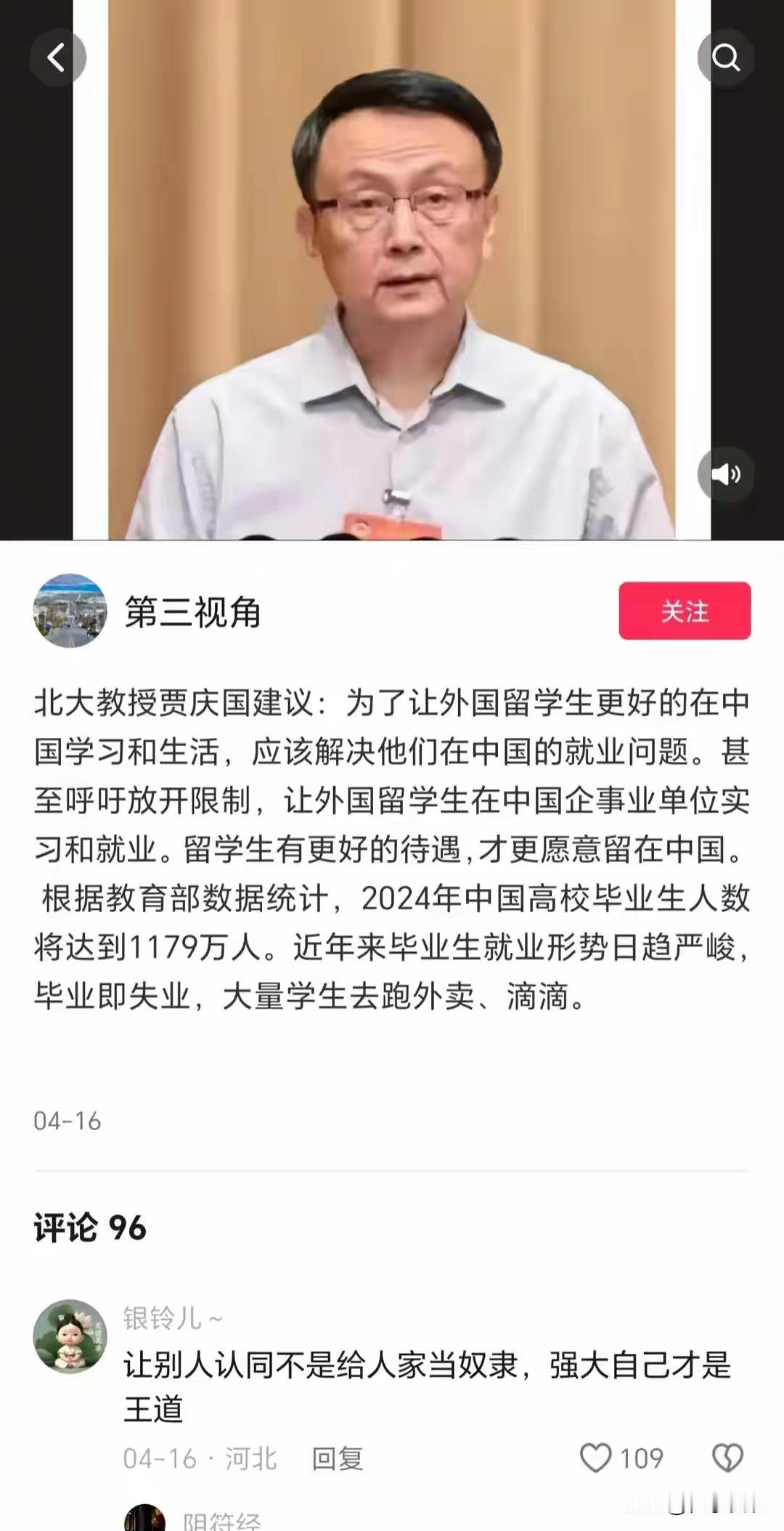 关于最近大家关心的 ,沈逸 老师旗帜鲜明的站了出来,希望沈逸老师不会被禁言,后续也不会删帖。 总之,我还是明确支持 ,结合之前北大贾庆国教授 呼吁支持外国留学生解决工作问题的提议,这样就可以为外国留学生在华就业打造完美闭环了,同时因为国内女拳早已经把中国男性的社会地位打压到尘埃地位,“女性媚外”与“洋人就业”两个重要环节终于实现历史性联动,如此一来经济和人口复苏岂不指日可待。 虽然国内大学生从入学那天起,无论住宿条件、学费补贴、教育资源、异性陪读资源、毕业条件等等,都无法与洋留学生相提并论,但是,只要毕业后好好能做好外卖小哥的角色,给“洋留学生”和女拳组成的家庭好好服务到位,肯定是一件非常有前景的工作! 所以,你们都是杞人忧天,无病呻吟,纯粹是想多了。我再次强烈支持