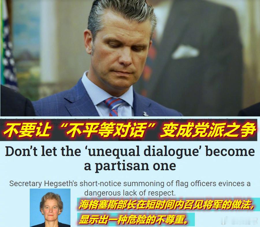 今天美退役空军准将、军事组织学者(2019年曾出版《揭秘美国军事:自1789年以来的机构、演变和挑战》一书)发布文章,批评美防长海格赛斯“面晤”数百将军的做法,她写到:“如果这样的行动继续下去,他们可能会在将军和军官队伍中形成深刻的文化变化——一种由党派而不是宪法塑造的文化变化”。
