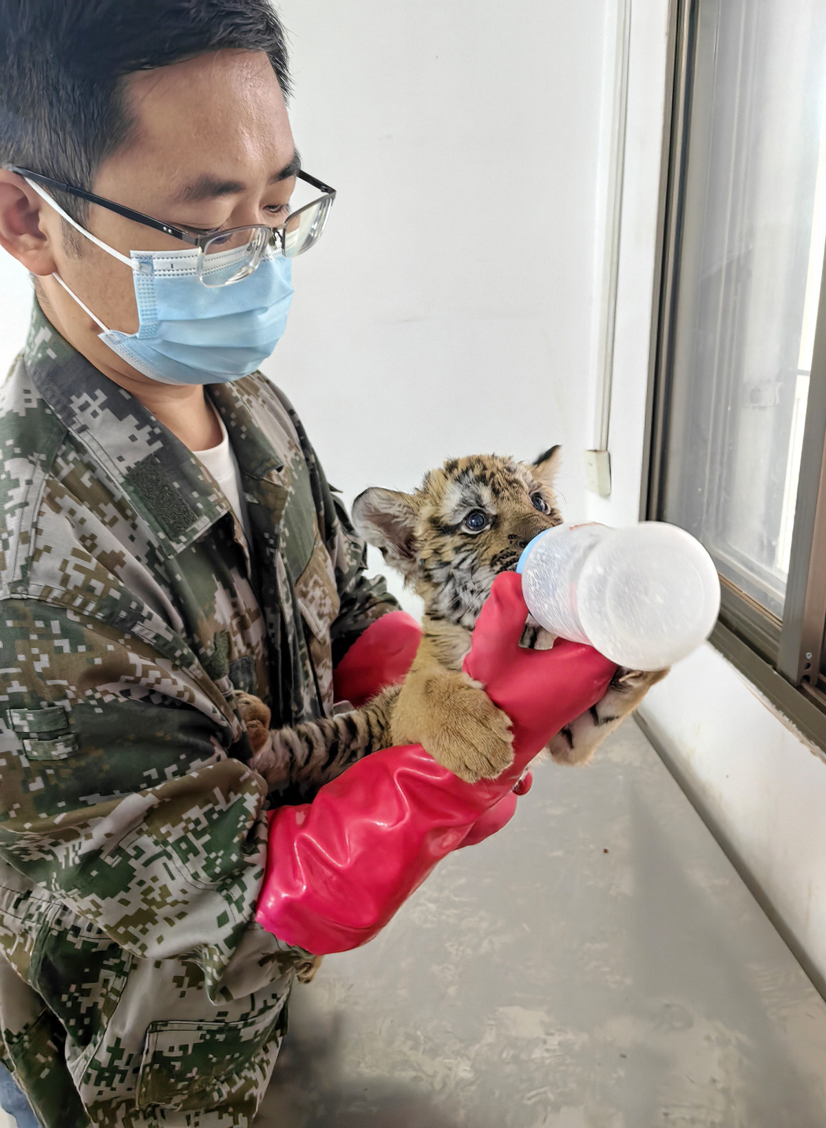 “我们当即决定人工育幼。”刘兆阳说,团队从调配专用奶粉、用棉签模拟虎妈妈舔舐促进幼崽排便,到精准调控育幼箱温湿度模拟野外环境,经过100多天的日夜守护,3只幼崽全部存活。这一突破,让洛阳成为全国人工繁育华南虎的“最北点”。