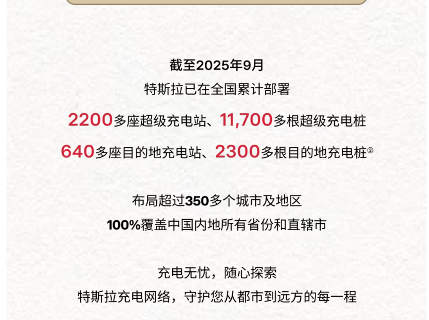 特斯拉的底气,来自其密集的超充网络。截至今年9月,特斯拉已在全国部署2200多座超级充电站、11700多根超级充电桩,还有640多座目的地充电站、2300多根目的地充电桩,覆盖超过350个城市及地区,且100%覆盖中国内地所有省份和直辖市。