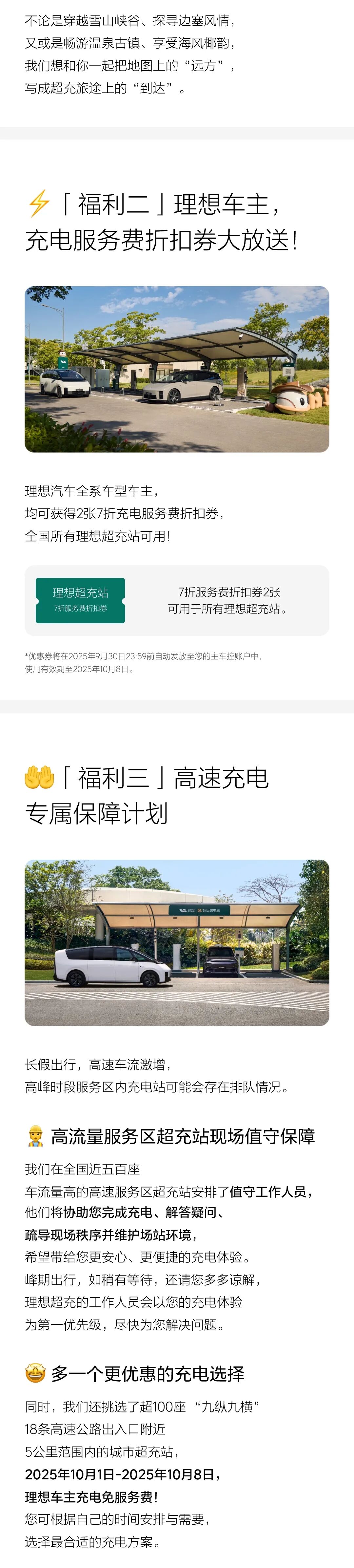 权益一:6条热门路线免服务费:10月1日至8日,理想全系车型在G318川藏线、新疆伊犁环线、长白山线、西北边塞景观线、海南环岛线、滇西旅游线这6条路线的61座超充站内充电,免充电服务费。