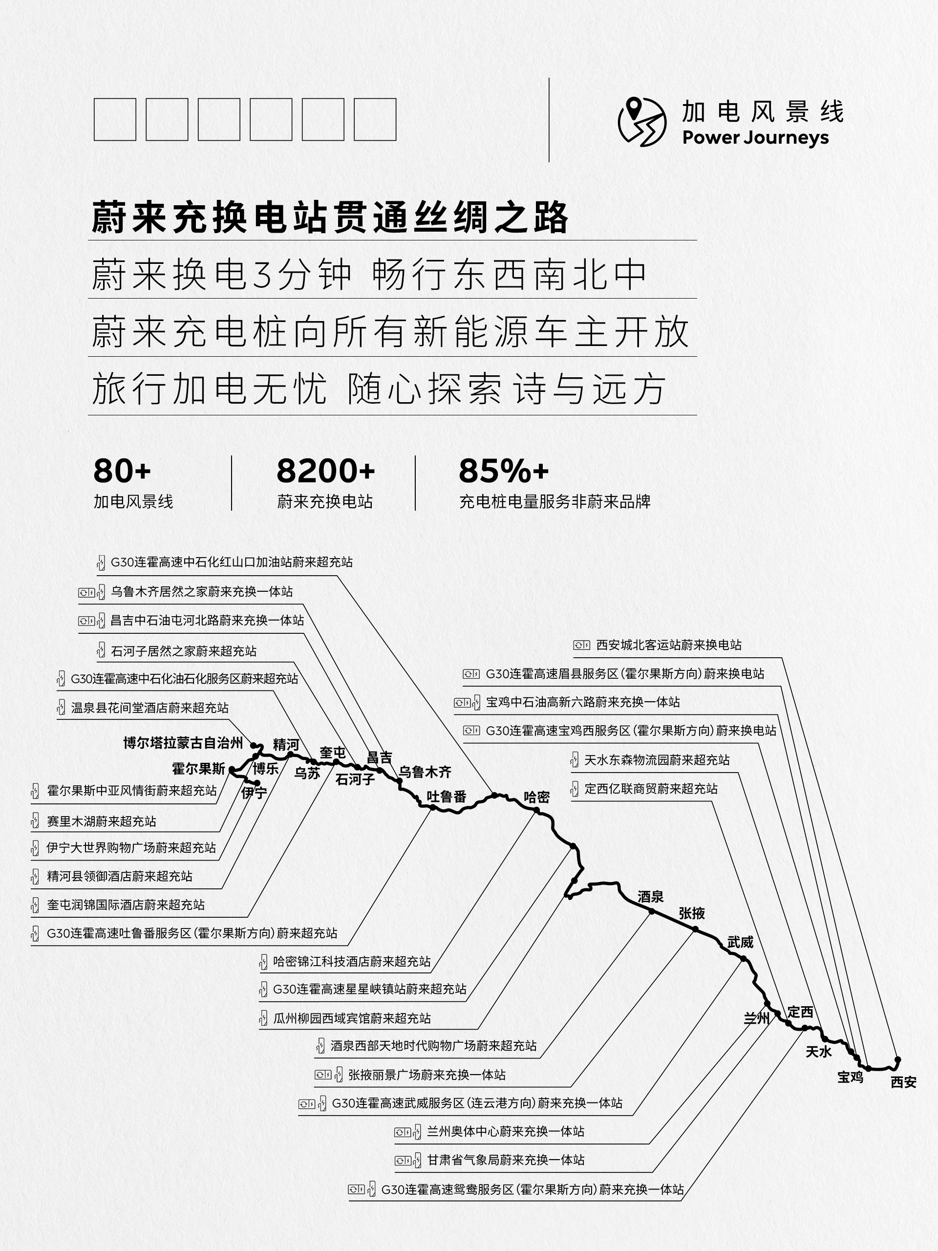 丝绸之路线:从西安到乌鲁木齐,全程133公里,沿途布局11座换电站、24座充电站,覆盖兰州、敦煌等关键节点。不管你是想在河西走廊看戈壁,还是在乌鲁木齐吃手抓饭,都能随时补能。