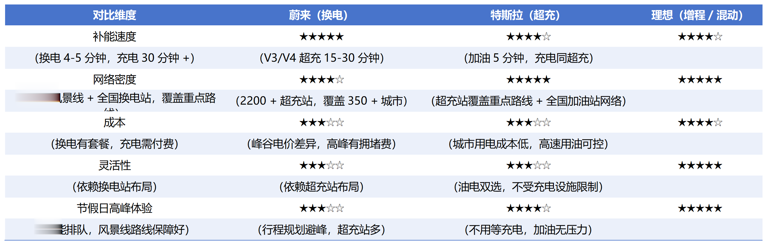 为了让大家更直观对比,我们从补能速度、网络密度、成本、灵活性、节假日高峰体验五个维度,给三大方案打分(5星为满分):从表格能看出,三大方案各有侧重: