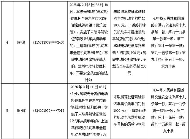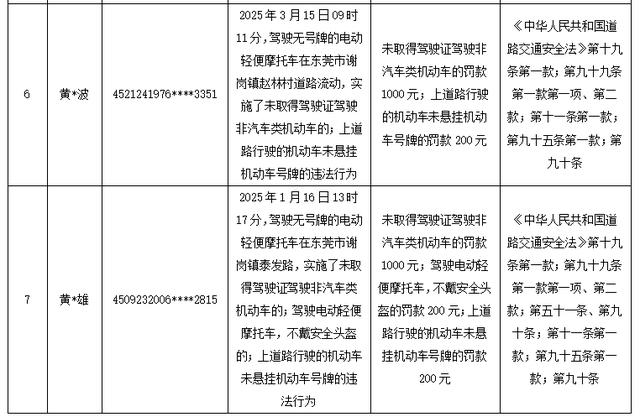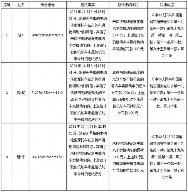 以下七名驾驶人,因道路交通安全违法行为,被东莞市公安局交通管理支队谢岗大队查获,当事人未在法定期限内接受处理。根据《中华人民共和国行政处罚法》第四十四条、《公安机关办理行政案件程序规定》第一百六十八条等规定,现将其对应违法事实、理由和处罚依据公告告知如下,根据《中华人民共和国行政处罚法》第四十五条,当事人有提出陈述和申辩的权利。如提出陈述和申辩的,请自公告之日起七日内向东莞市公安局交通管理支队谢岗大队(东莞市谢岗镇眼口工业区东风西街3号)提出,逾期不提出的,视为放弃陈述和申辩。(清单附后)