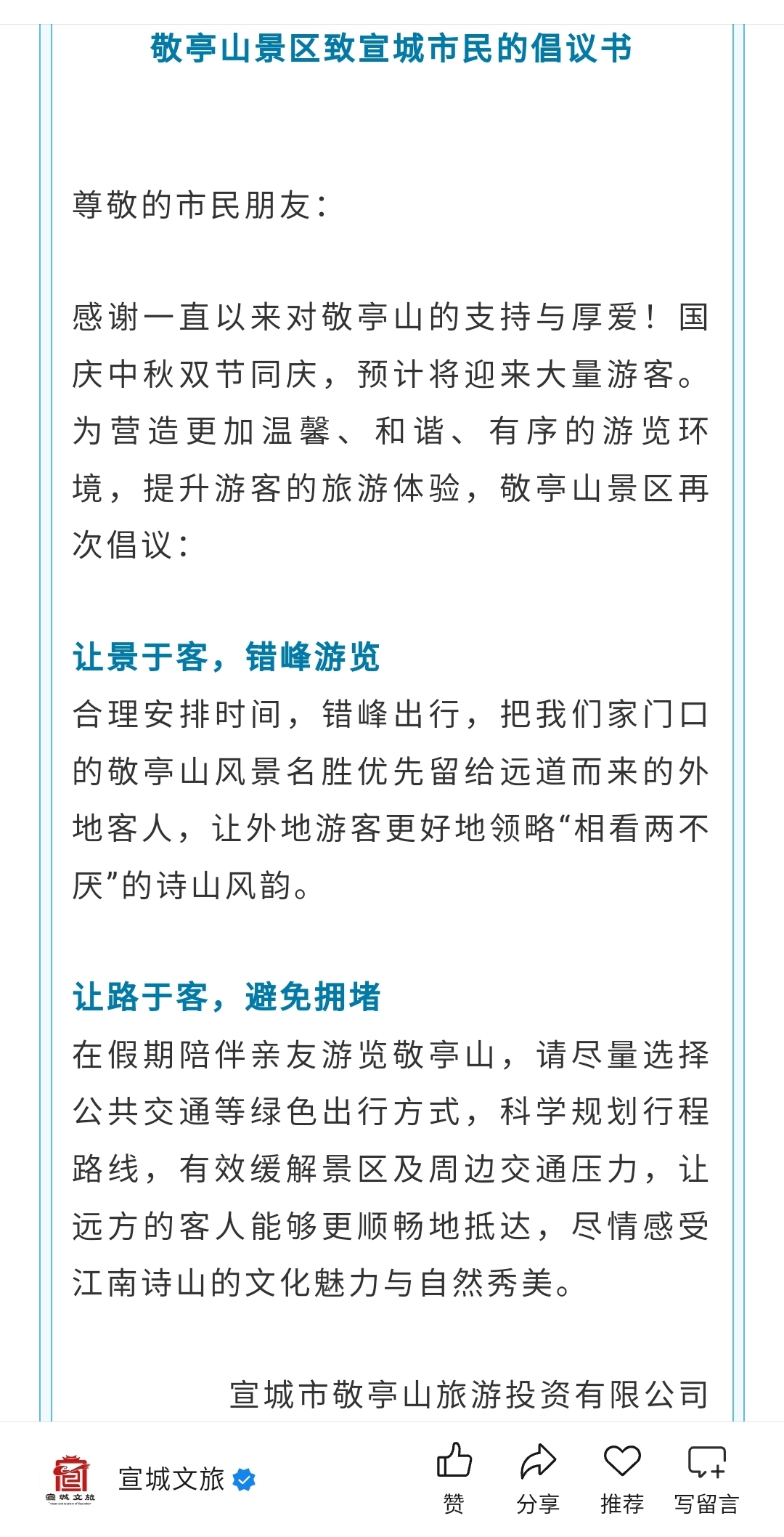 其中称,国庆中秋双节同庆,预计将迎来大量游客。为营造更加温馨、和谐、有序的游览环境,提升游客的旅游体验,敬亭山景区再次倡议:让景于客,错峰游览。合理安排时间,错峰出行,把家门口的敬亭山风景名胜优先留给远道而来的外地客人,让外地游客更好地领略“相看两不厌”的诗山风韵。
