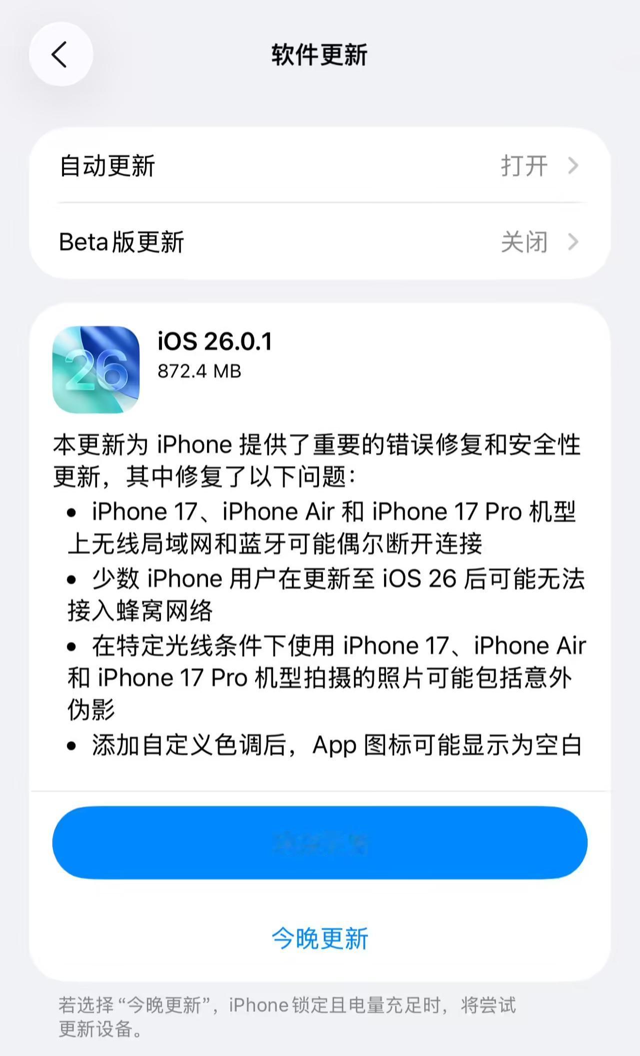 苹果推送iOS/iPadOS 26.0.1系统更新,主要还是修复Bug 就在刚刚,苹果向iPhone和iPad用户推送iOS/iPadOS 26.0.1系统更新,内部版本号23A355,这是自上次推送大版本系统后的第一次小版本升级。通过更新日志不难看出,该系统主要是修复各项Bug,增强系统稳定性。例如针对iPhone 17系列及iPhone Air机型,重点修复WiFi或者蓝牙连接不稳,出现断连的情况。此外,更新还解决了相机在特定光线条件下的拍照可能出现伪影。反正我自己第一时间升级后,确实感受到了一丝变化,流畅性有了点提升,并且Bug大大减少了。不得不说苹果这效率还是蛮高,各位觉得怎么样呢?