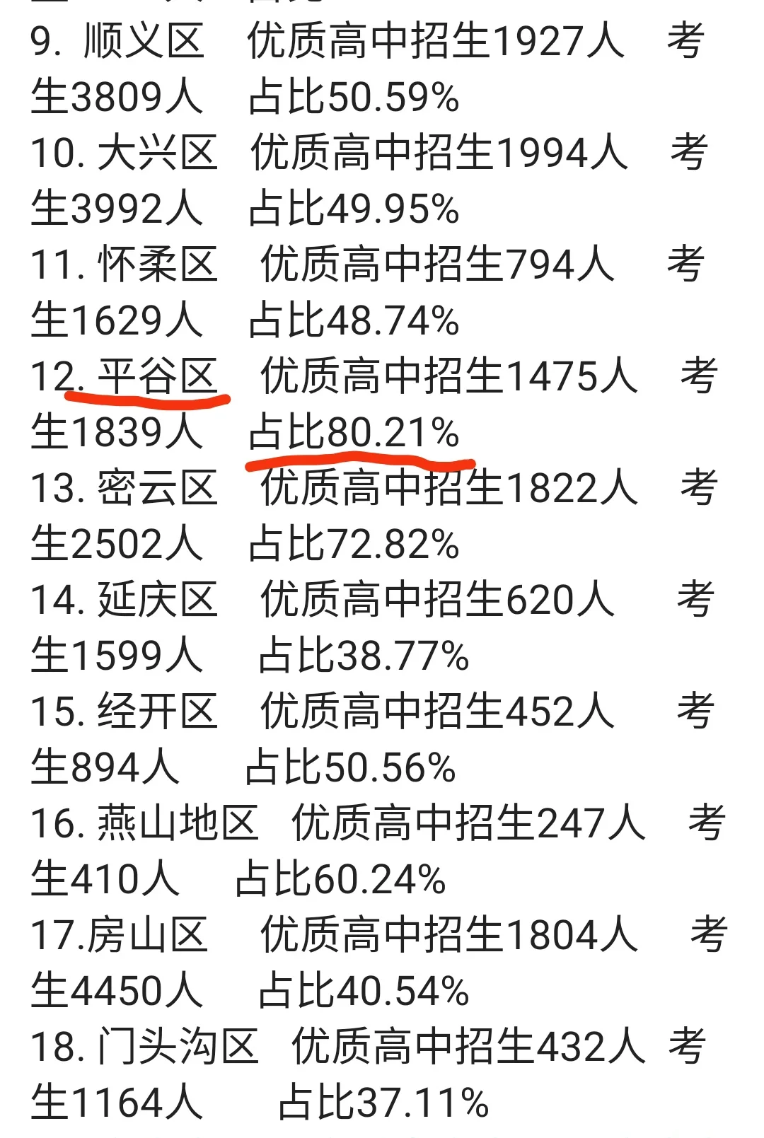 别看平谷区中考升入优质高中的比例达到了惊人的80%,但整体实力依然很差,跟城区差的还很多,尤其跟东西海三个区。密云的比例也很高,但好歹还有个密云二中。平谷的高中最好的是平谷中学了吧?平谷区第五中学、北京实验学校及北京师范大学附属中学平谷第一分校说是优质学校,但大家心里都明白是怎么回事。