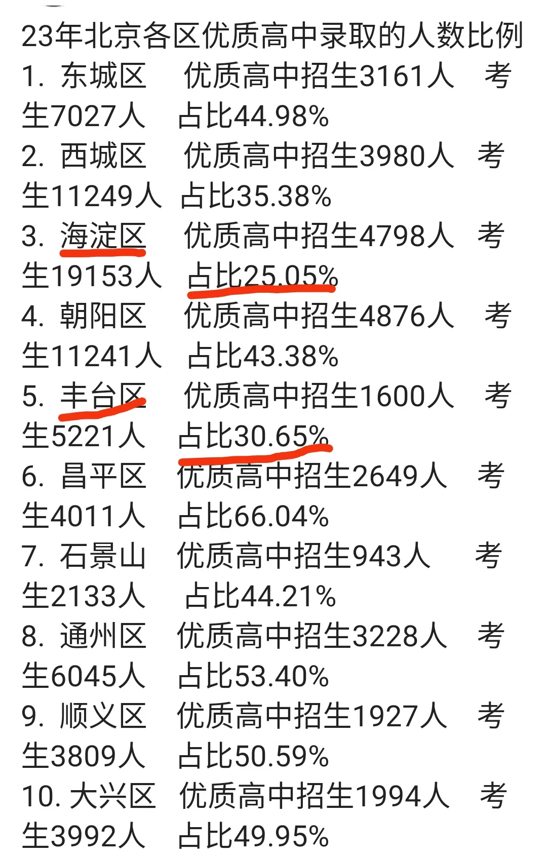 几年前听说过一件事,平谷某初中的孩子通过市级统筹考到了海淀的优质高中,结果高考考了个市属二本,北京XX学院的那种。要知道,这孩子中考可是全校第一才有机会走市级统筹,可想而知当地学校的整体实力。别看海淀学生能上优质高中的比例不高,可以说最低了,但那些成绩中等够不上优质高中的孩子真的还可以,比郊区一些排在年级前列的孩子还要有实力。