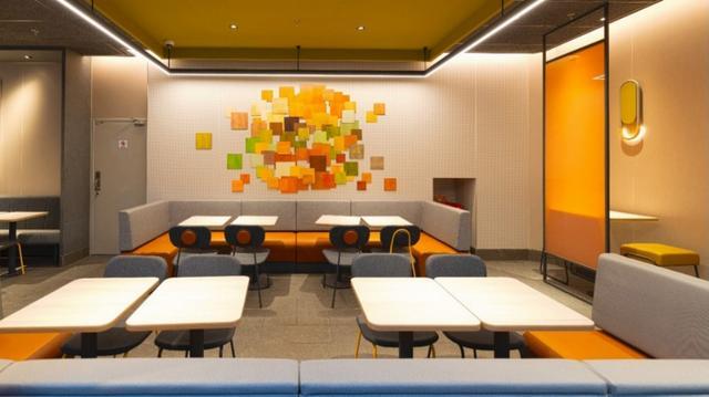 平安悦坊餐厅位于杭州市钱江新城CBD核心区平安金融中心一楼。餐厅以麦当劳经典开心乐园餐餐盒HMBOX为灵感,运用“Cube”设计理念,融入立方、暖色、隐藏的微笑三大设计元素,营造出温馨且充满童趣的用餐氛围。餐厅还特别设置了杭州首个“开心魔力盒”,标志性阳光黄的鲜艳大盒子,可以透过数字化互动屏幕观看麦当劳四小福的3D裸眼动画,更有以麦当劳产品为题材的“汉堡挑战赛”主题游戏,让小朋友在互动动画和汉堡食材叠叠乐的游戏中尽情享受沉浸式欢乐。