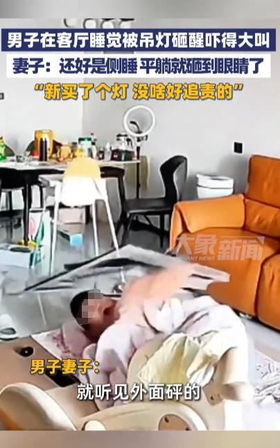 “防不胜防!”9月29日,北京,一男子在客厅午睡,头顶上的吊灯突然掉下来砸中男子