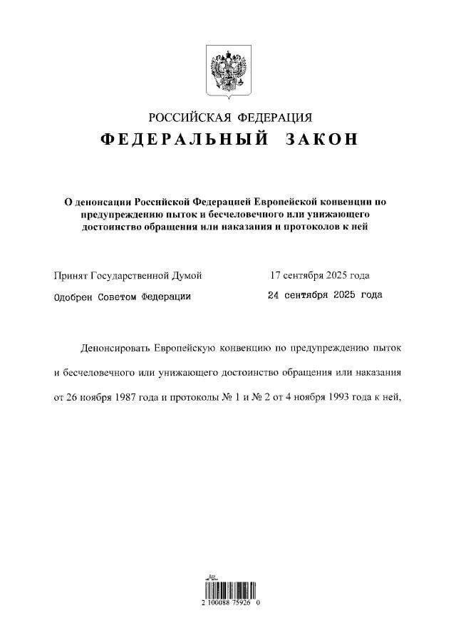 普京签署了一项“允许‘俄罗斯国家航天集团’在火箭、卫星和航天基础设施上投放广告”的法律。 该法律规定了确定广告费用支付金额的程序、支付方式以及交易是否需要政府批准。 俄罗斯国家杜马对该法案的说明指出,在航天设备上投放广告每年可为预算带来高达2亿卢布的收入,在基础设施上投放广告每年可为预算带来高达500万卢布的收入。该法律将于2026年1月1日生效。 俄罗斯总统普京签署了正式退出《欧洲禁止酷刑公约》的法令,结束了欧洲禁止酷刑委员会对其监狱的国际检查。