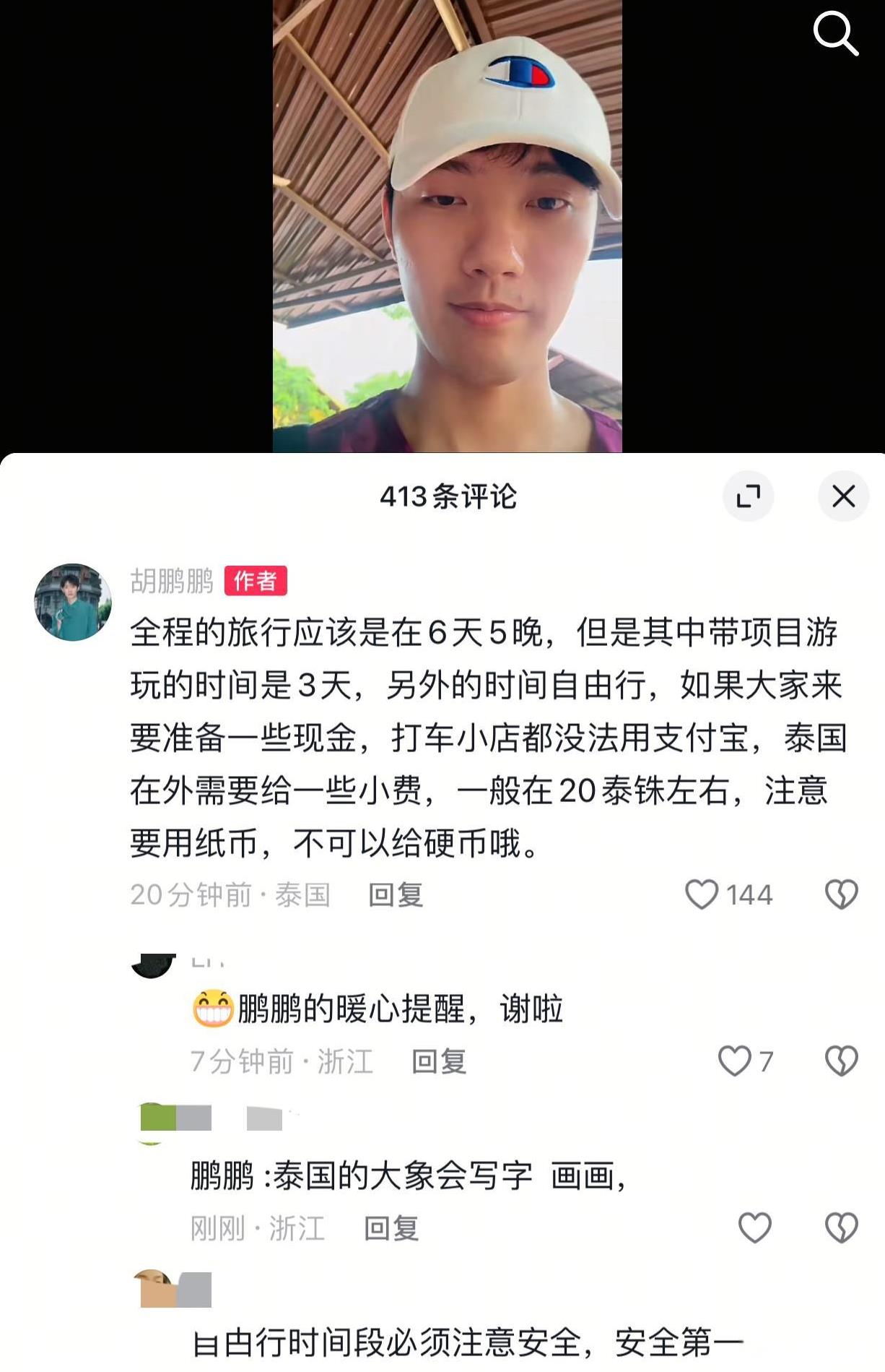 鹏鹏去泰国旅游变乖了 每天发视频报备,获得了粉丝们的称赞 变成了主播团里最贴心的主播[耶] 今天他的视频里出现了一段女声 评论区里很多人猜测是女朋友 难道鹏鹏要脱单了? 其实不是,看了鹏鹏写的内容 他是报小团去的,还补了单人房费 碰到了很好的哥哥姐姐们 所以不是女朋友啦 至于在旅途中 有没有一段浪漫的邂逅 那就不得而知啦[偷笑] 希望鹏鹏能有[耶]