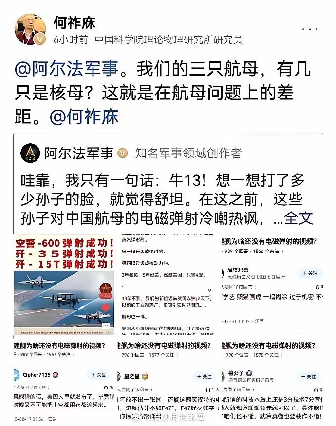 闻思录‖对福建舰的战力,老美给“差评”也就算了,国内公知尤其是何院士也阴阳怪气,不知收了多少狗粮? 福建舰成功电弹三型舰载机后,美国在震惊之余,一些网民很不服气,说什么“中国偷窃抄袭美国技术”,“中国的航母是垃圾”等等,这是“酸葡萄”心理,中国的电磁弹射是“中压直流技术”,美国采用的是“中压交流技术”,中国何来偷美国的技术? 国外网民给福建舰“差评”也就算了,这是他们的本性。但国内一些公知,特别是像何院士这样的大知识分子也阴阳怪气地说“中国有几只核母”?仿佛只有美国核动力航母才是天下第一。 要知道,航母只是一个飞机平台,航母战力体现在舰载机上。美最先进的福特级航母服役8年了,至今末弹射过五代机F35C,他们E一2D预警机没有相控阵雷达,探测不到隐身战机。 福建舰电弹的空警-600,有最先进的相控阵雷达,可在600公里处探测到美国航母电弹的超级大黄蜂F/A-18E/F,配合歼-35,可快速将其击落。 另外,我航母编队的“带到护卫”055大驱是“地表最强驱逐舰,112个垂发单位,携带的鹰击21多款超高音速导弹,可对美航母实施定点清除。 何院土不会连这点都不知道吧。