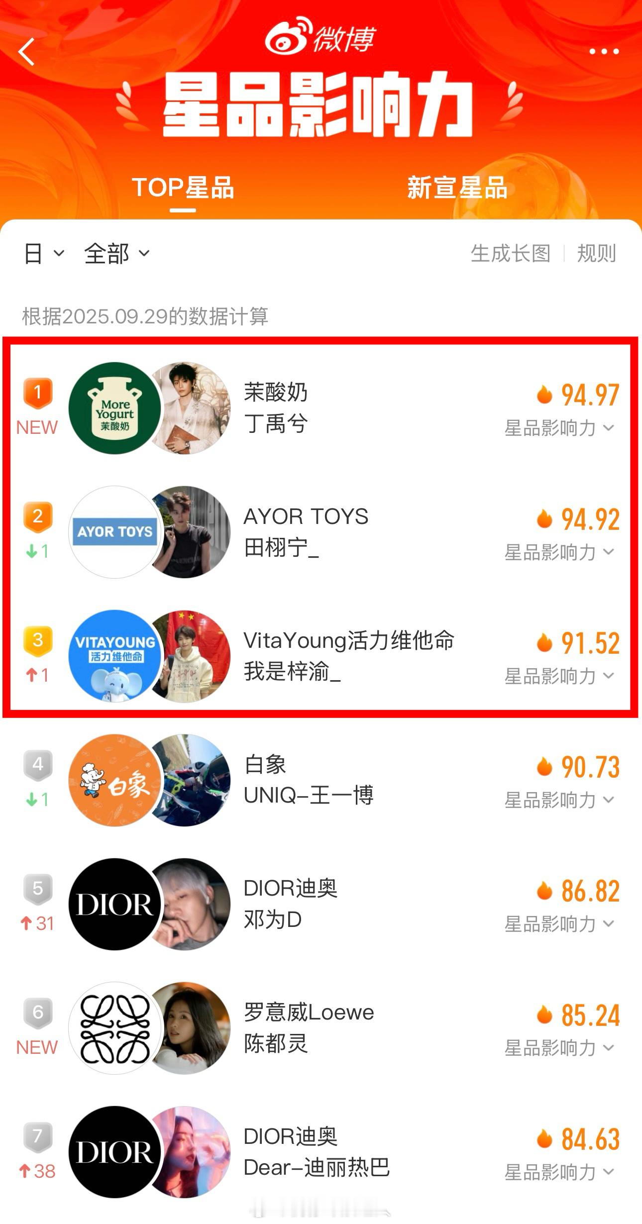 星品影响力最新排名前三:丁禹兮、田栩宁、梓渝星品影响力