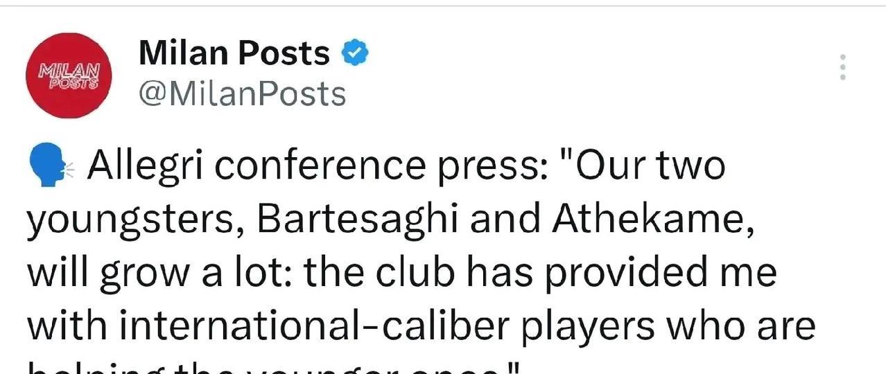 为巴特萨吉与阿泰卡梅感到高兴。阿莱格里新闻发布会表示对于巴特萨吉与阿泰卡梅的成长而感到高兴,同样感谢俱乐部为我提供了众多国际水平的球员,这些球员会带动年轻球员的成长。 巴特萨吉防守还行,进攻拿球多是安全球之前有老哥评价巴特萨吉就是标准的边后卫踢法,个人觉得这位老哥评价十分准确,巴特萨吉貌似就是标准化球员,能力比较平均,能做好自己要做好的事情,针对巴特萨吉属于你可以放心他的下限,但也不能太高期待他的上限,不过这个事情也有例外,比如萨勒马克尔斯,之前萨勒马克尔斯就属于你可以不用担忧他的下限,但也没办法期待上限,谁能想到萨勒马克尔斯外出游历两年进阶了,就看巴特萨吉是不是也有进阶的机缘了。 至于阿泰卡梅,我觉得肉眼可见的紧张,最简单的球拿的腿抖,和第一场那个荷兰小孩一样,问题是荷兰小孩后来不紧张了,阿泰卡梅之前都完成首秀了,咋还紧张呢,是因为对的是那不勒斯?还是因为米兰少打一人自己担忧自己出现疏漏?患得患失,必定怅然若失,年轻球员就要有拼劲,就要去抓住机会展现自己,当然无论是阿泰卡梅还是巴特萨吉都表现不错,感觉那不勒斯之战,他们能有所收获。