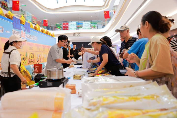 活动现场人头攒动,互动氛围热烈,孩子们踮着脚尖围在水缸旁,看金黄的大黄鱼摆尾游弋;工作人员教孩子们认识岱衢族大黄鱼,讲述黄鱼“七兄弟”的趣味故事;非遗代表性传承人支起画纸,一条灵动鲜活的大黄鱼拓在纸上,引得现场观众惊叹;科技装备区集中展示深远海养殖平台、声波海洋牧场、潜降式深水网箱等智能化设施,直观呈现浙江大黄鱼养殖从“近海”向“深远海”、从“传统”向“智能化”的转型成果;地市参展区更是把“鲜”字拉满,汇聚宁波、温州、舟山、台州等地的特色大黄鱼品牌,刚出锅的清蒸大黄鱼鲜香扑鼻,雪白的鱼肉轻轻一夹就分成蒜瓣状,更有大黄鱼刺身、蜂窝大黄鱼、黄鱼鲞、黄鱼春卷、黄鱼鱼饼、黄鱼海参丸等特色美食……