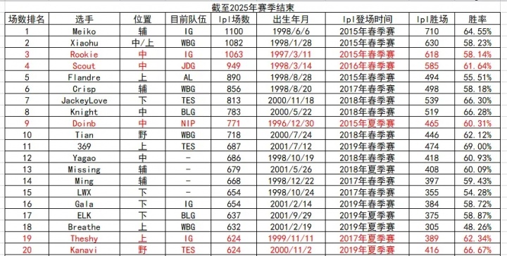 直播吧9月30日讯近日,有豆瓣网友整理了LPL选手出场次数以及胜率,其中出场次数最高的为iG辅助Meiko,其出道至今一共在LPL赛场征战1100场次,胜率达到64.55%;其次则是Xiaohu、Rookie、Scout以及Flandre!