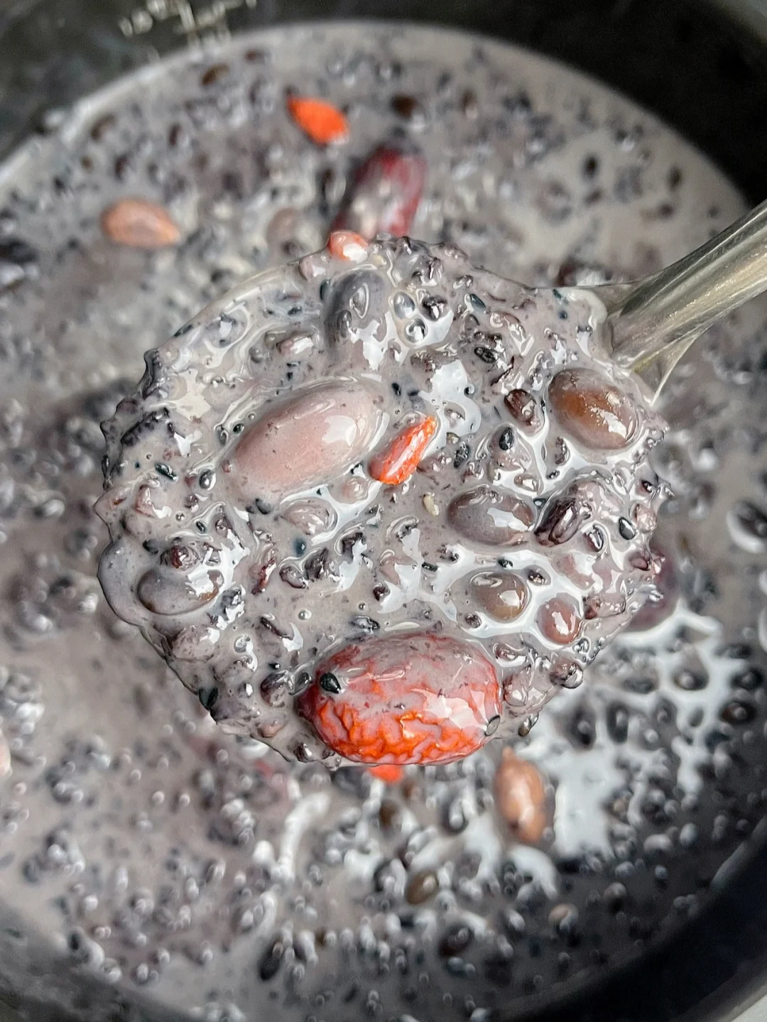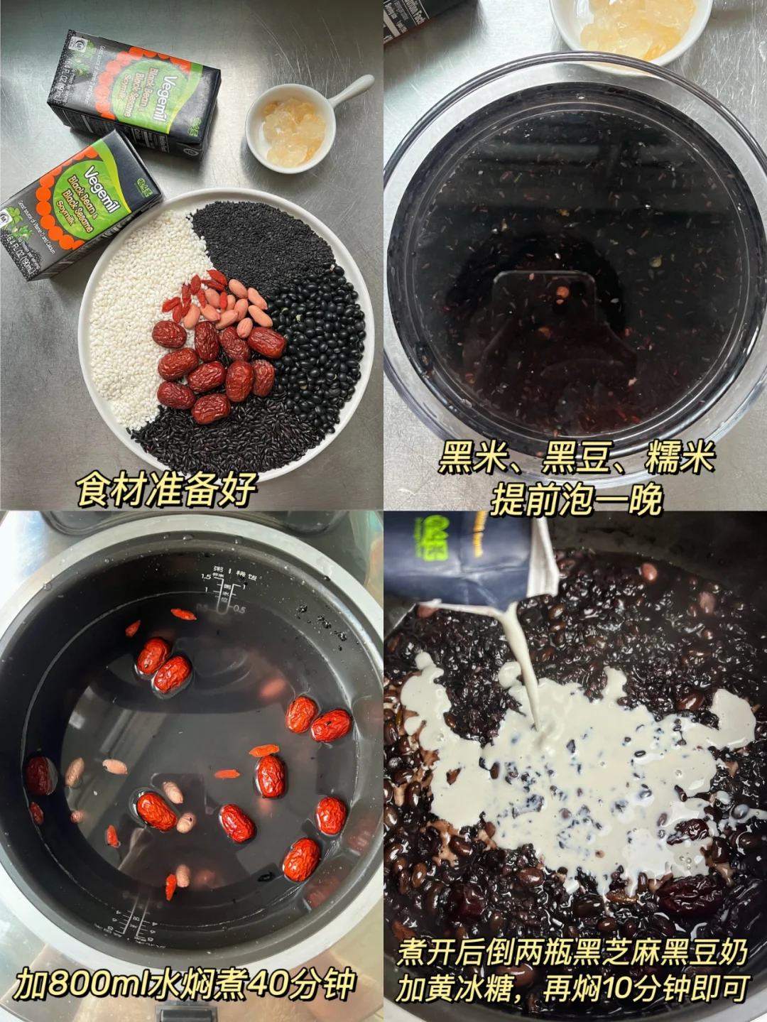 👉食材:黑米100g、黑豆80g、黑芝麻30g、糯米100g、花生30g、红枣10颗、一小把枸杞、黑豆奶、水、少许黄冰糖