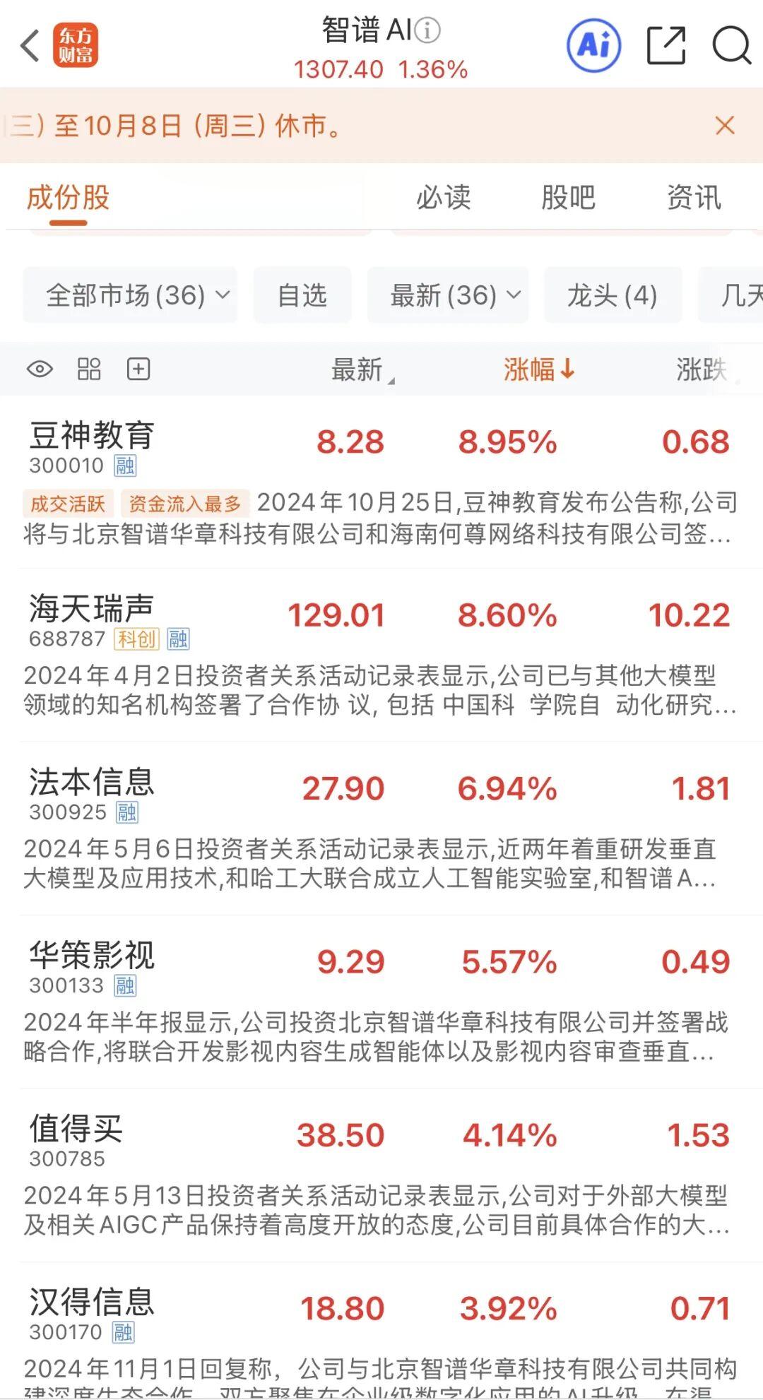 二级市场方面,9月30日,智谱AI概念持续活跃,海天瑞声、豆神教育、法本信息等多只个股大涨。