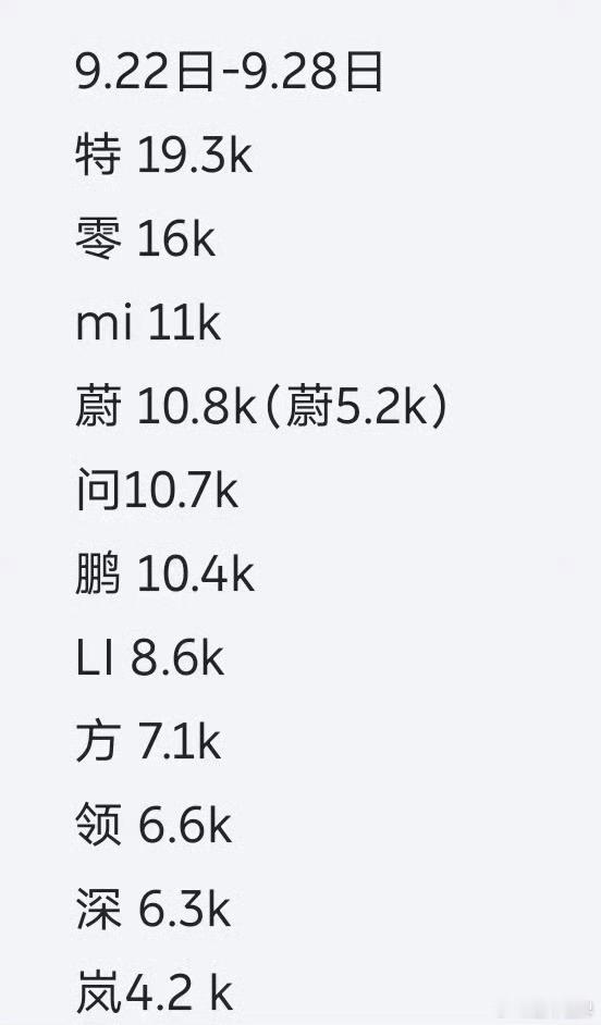上周新势力「神秘数据」统计还是来了,有几个小数略有差异,不影响大盘排名。