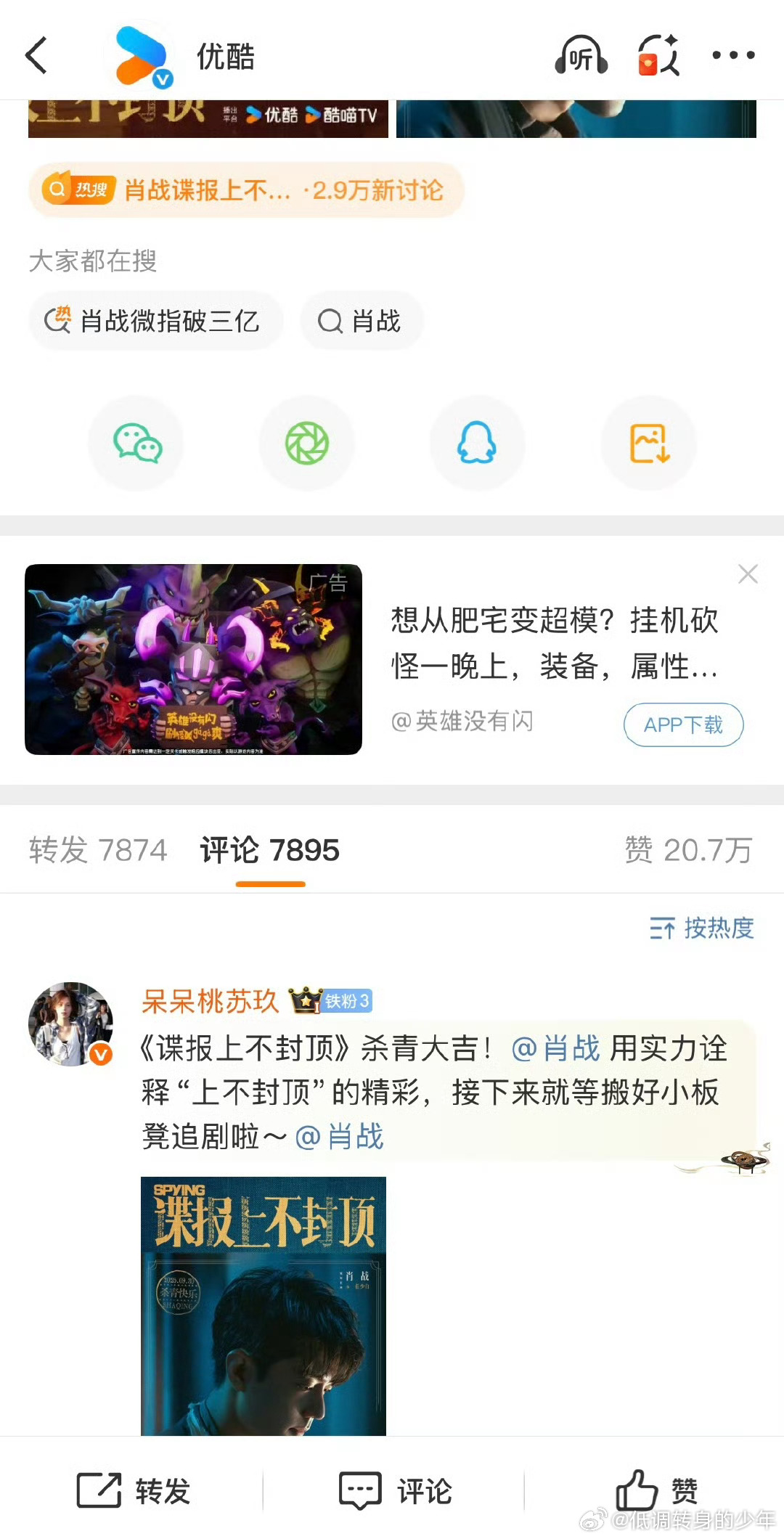 谍报上不封顶杀青肖战谍报上不封顶杀青肖战这热度太牛了,优酷刚发的《谍报上不封顶》杀青微博15分钟就有11万赞,25分钟20万赞 🔥🔥