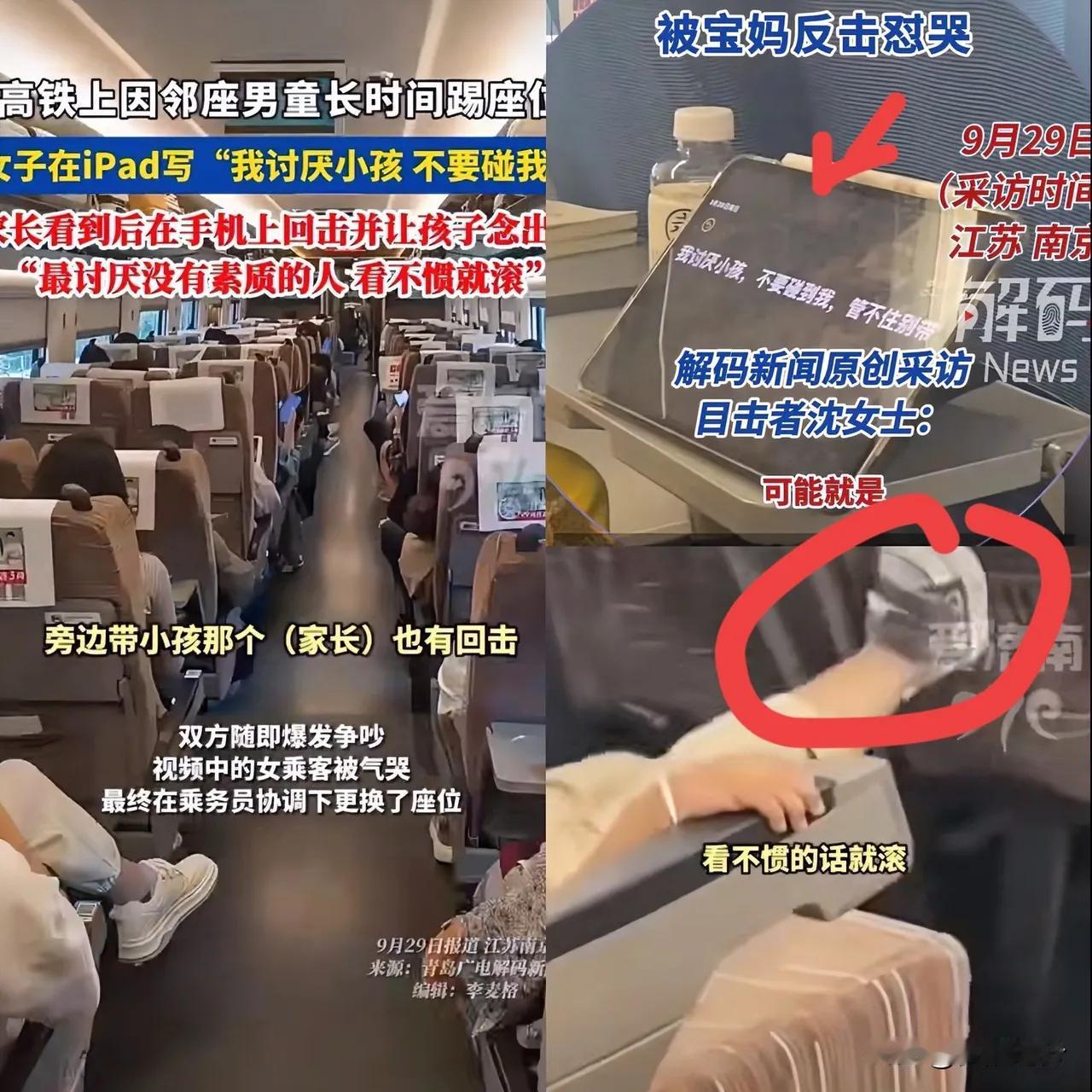 在高铁上,一名女乘客因邻座男童长时间踢其座位,于是在ipad上写着,“我讨厌小孩,不要碰我,管不住别带”没想到这一举动激怒男童家长,在手机上打出“最讨厌没有素质的人,看不惯就滚”,并让孩子大声念出这句话双方为此大吵一架,女乘客被气哭,最终由乘务员协调更换座位。 网友评论: 换做我的小孩这么踢别人的椅子,影响别人,我自己先把小孩子揍一顿,不然就是丢我的脸,太没教养 我有一次用我的车拉了个外地过来来谈合作的一家三口,带个4岁的孩子,男的坐副驾,女的和小孩坐后排。第二天发现副驾座位后面全是小孩的脚印。就因为这么小的事,我选了其他人 我暑假高铁回去,路上两小孩大声说话,就是两个一直在吵闹,他后面乘客实在忍不住了,大声吼他们,你们不要吵了,哎呦,后面孩子妈妈骂得可难听了,几乎每句带妈骂他,乘警来了也不停,乘务员也说了,每次过来都提醒他们家长小声一点。 以前大家都知道要脸, 出门一举一动都是家教,不然人家说你教养不好,有人生没有教。现在社会变了,大家都不在乎了,孩子不是那种生病的吵闹,就是家长的问题,孩子小不懂事,可能大人比孩子还不懂事。 教养就是从小从点滴养成的习惯。 来源:梦醒时分