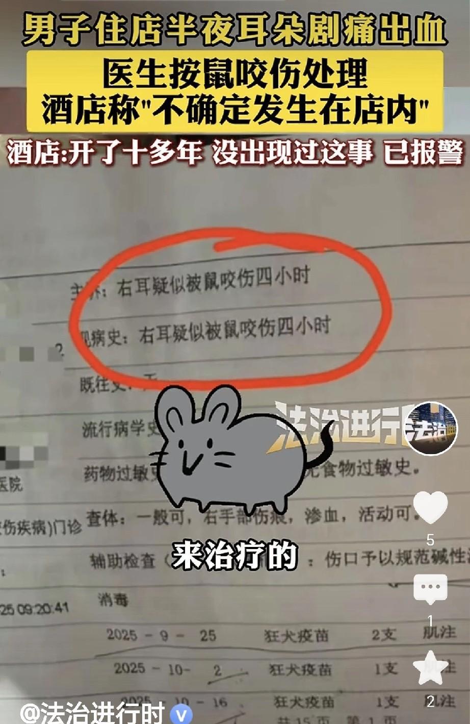 上海,一男子和朋友入住酒店,正睡的香甜,突然感觉右耳朵持续疼痛,他用手一摸,吓一大跳,开灯一看,耳朵上血流不止,他听到‘咯吱’一声,怀疑是被老鼠咬了,他找酒店,前台陪他来到医院,男子右耳有伤口,疑似三个牙痕,伤口深处发黑,医生也不确定是什么东西,就按老鼠咬伤的办法给他治,注射了狂犬疫苗,还打了破伤风针,酒店提出,免住宿费,支付第一次和后续两次的治疗费,再给他1000元赔偿金,男子拒绝,害怕有后遗症,不要1000元赔偿,只要酒店给他把伤治好,酒店甩锅: 已经报警,不确定是不是在我们酒店发生的! 9月25日凌晨,4点左右,陈先生和朋友住进了上海某连锁旅店,谁知当晚,出了大事,陈先生的耳朵不知被什么咬伤了。 他原本高高兴兴,忙碌了一天,晚上在酒店里甜甜的睡去,谁知睡着睡着,突然感到右边耳朵持续的疼痛。 他迷迷糊糊,顺手摸了下耳朵,瞬间被惊醒了,手里似乎粘上了什么,湿乎乎的。 他不放心,立刻把灯打开,他看到手上满都是血,顿时吓的心惊胆颤。 朋友赶忙帮他一看,原来他的右耳朵烂了,似乎是被什么咬伤,血流不止,朋友赶忙拿出纸巾为他擦拭。 这个时候,他听见“咯吱”一声,似乎是老鼠的叫声,陈先生心里咯噔一下,莫不是被老鼠咬伤了耳朵? 万一是老鼠咬伤,老鼠带有病菌,后果不堪设想,陈先生更加着急,急火忙慌给前台打去电话。 前台值班人员迅速赶到,一看陈先生手里的纸巾,上面满满都是鲜红的血迹。 酒店前台陪着陈先生赶往医院,到了医院,进入了医院的急诊科里。 这个时候,是25日9点06分,离咬伤时间大概过去了4个小时。 医生左看右看,并不确定是什么咬伤的,陈先生主诉,他听到“咯吱”声音,怀疑是被老鼠咬了。 医生发现,陈先生右耳红肿,被咬的伤口在耳廓上侧,陈先生拍了照片,被咬后耳廓处出现三点伤痕,疑似什么动物的牙痕。 并且,牙痕深处有些发黑,会不会感染病毒,陈先生越想越怕。 医生立刻行动,就当被老鼠咬伤为他治疗,先给他注射了狂犬病疫苗,又给他打了破伤风免疫球蛋白注射剂。 医生给他清理了伤口,涂上了药物,并给他开具一些外用和口服的药品。 医生又给他制定了治疗计划,后续,他需要再打两次疫苗。 陈先生非常生气,自己住进酒店,对酒店的卫生安全很是放心,他没有想到,酒店里会出这种事情。 酒店承认,陈先生受伤的事情,但是,陈先生的伤口并不确定,到底是老鼠咬的还是虫子咬的。 酒店理亏,当天就给陈先生支付了医疗费,并向陈先生提出,免除他在酒店的住宿费。 酒店答应,后续两次治疗费用,依旧由酒店承担,酒店再给陈先生赔偿1000元js损失费。 可陈先生不同意了,我住在你们酒店,你们不能保证顾客的安全,更何况到底被什么东西咬伤,并没有确定的说法。 虽然现在,已经打了狂犬疫苗,陈先生依旧担心,后续身体会不会产生并发症。 并且,他身体上还有其他伤口,疫苗打完,后期会不会产生不良反应,这都是未知。 如果现在看不出来,将来发病,又会怎样,老鼠本来就是传播病毒的载体之一,比如,过去就出现过鼠疫。 陈先生越想越怕,这次经历,留下一辈子的阴影。 所以,他要求酒店要给他治疗好,酒店所谓的赔偿方案,他不接受,那1000元赔偿,解决不了问题,如果以后留下什么后遗症又该咋办? 9月26日,酒店负责人做出回应,他们已经排查了酒店,并没有发现有什么异常。 目前警方和相关部门已展开调查。 有人认为,酒店的安全,不只是防火,无虫害也是必须的,这个酒店显然做的还不到位。 也有人说,在酒店下榻居然被老鼠咬伤,还是第一次听说过,酒店在管理方面还是有漏洞,积极赔偿受害人的医疗费和精神损失费,这种态度也是好的。 更有人说,打疫苗和赔偿,酒店没有毛病,后续再有别的问题,如果患者能够证明与此次咬伤有直接联系的,再另行赔偿。 那么,这件事在法律上是怎么认定的呢? 《民法典》第1198条规定: 宾馆、商场、银行、车站、机场、体育场馆、娱乐场所等经营场所、公共场所的经营者、管理者或者群众活动的组织者,未尽到安全保障义务,造成他人损害的,应当承担侵权责任。 陈先生入住酒店,与酒店形成了服务合同关系,酒店作为经营场所,有义务保障陈先生的人身安全。 陈先生在酒店房间内睡觉时被不明生物咬伤,酒店未能提供安全的住宿环境,未尽到安全保障义务,应当对陈先生的损害承担侵权责任。 《民法典》第1165条第1款规定,行为人因过错侵害他人权益造成损害的,应当承担侵权责任。 陈先生在酒店房间内被咬伤,酒店存在管理不善的过错,应当承担相应的侵权责任。 包括但不限于赔偿陈先生的医疗费、误工费、护理费、交通费等合理费用。 如果陈先生因此次咬伤造成了其他严重后果,如留下后遗症等,酒店还应当承担相应的赔偿责任。 目前,警方和相关部门还在调查中。 关注@王哥说法 多学法律少吃亏!
