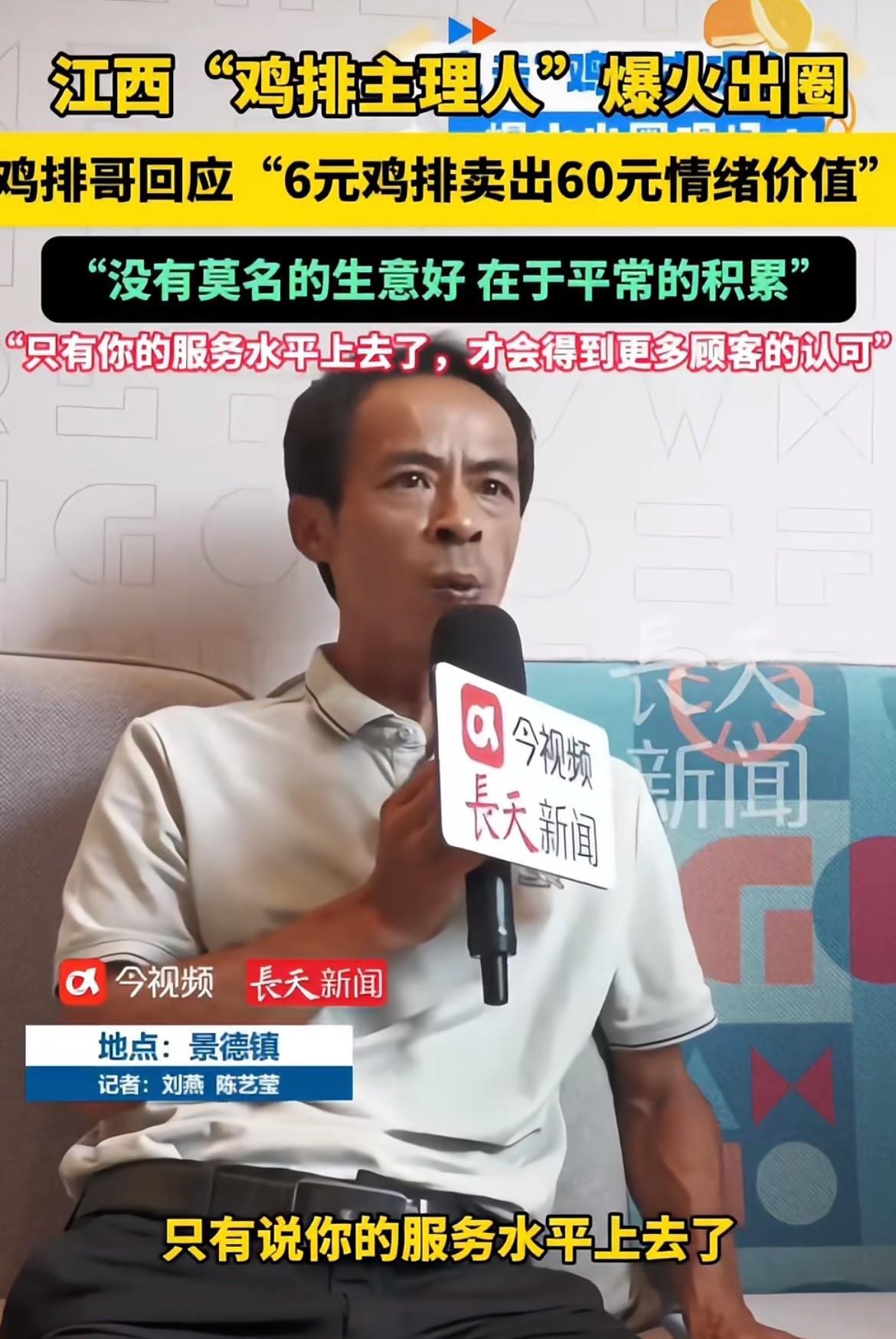 说实话鸡排哥能火我一点也不意外,他早就准备好了,只是等着被发现的一天。 大家喊他鸡排主理人,问他知道主理人是什么意思吗?他说在他的理解中主理人就是西餐主厨,对产品的把控是比较到位的,这是对他的一种称赞。 有人说他6元的鸡排卖出了60元的情绪价值,他说“没有莫名的生意好,在于平常的积累”,只有服务上去了才能获得更多顾客认可。 别人问他孕妇儿童会不会优先给他们做,鸡排哥回答,我们的顾客都很有素质,会同意的。这口才这情商怪不得卖鸡排都能卖出名来! 鸡排哥摆摊的食材都是新鲜现做的,多年如一日,在文旅座谈会上,他呼吁大家要做好食品安全和卫生把控,这一波又带飞了鸡排和景德镇文旅! 是金子总会发光的,鸡排哥的运来了,会说话干实事,这妥妥是“鸡层”走过来的“正摊级”领导! #鸡排哥# #你认为鸡排哥爆火的关键因素是什么# #鸡排哥高情商发言出圈#