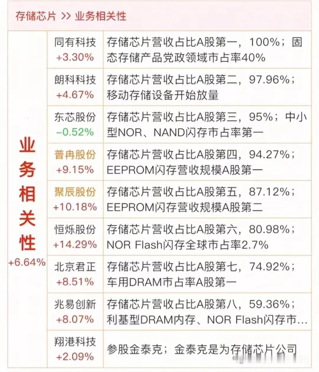 全球存储大涨价!美光科技宣布存储产品涨价20%-30%,三星电子内存、NAND闪存也上调价格,威刚还因供应紧张等情况调整供应策略,存储芯片市场变化值得关注。国内存储芯片龙头代表长江存储、长鑫存储。相关概念龙头企业有哪些?国内存储芯片行业领先公司还有普冉股份、聚辰股份、北京君正、兆易创新等等。(行业科普不作推荐,资料仅供参考不构成投资建议,理财有风险投资需谨慎!)