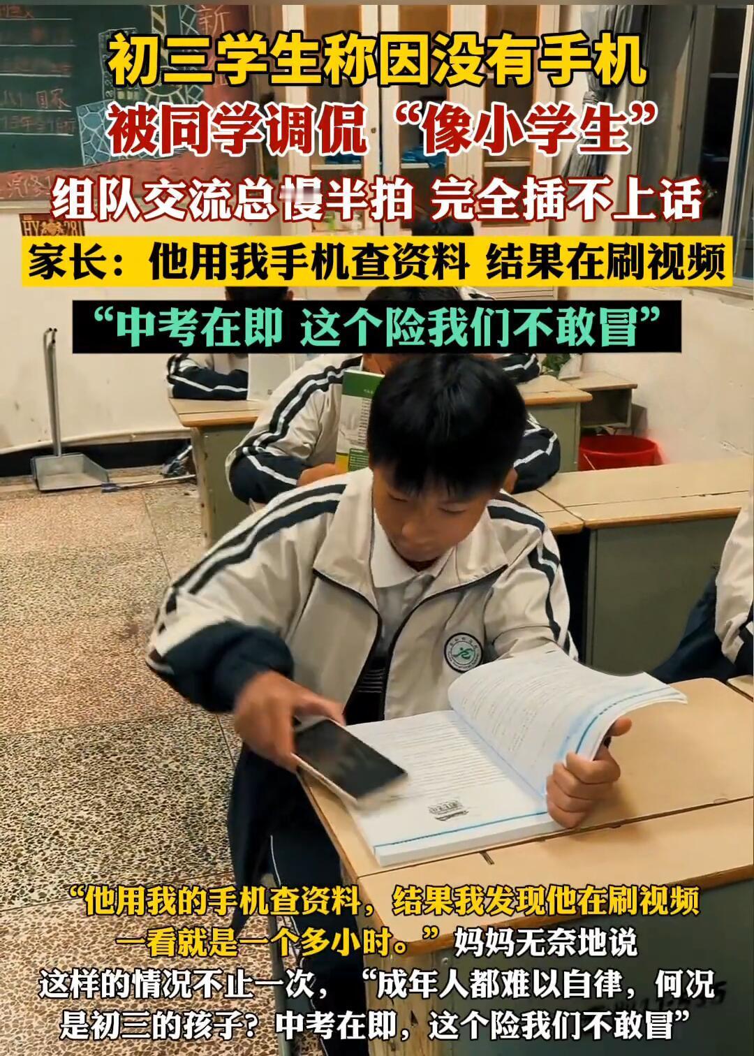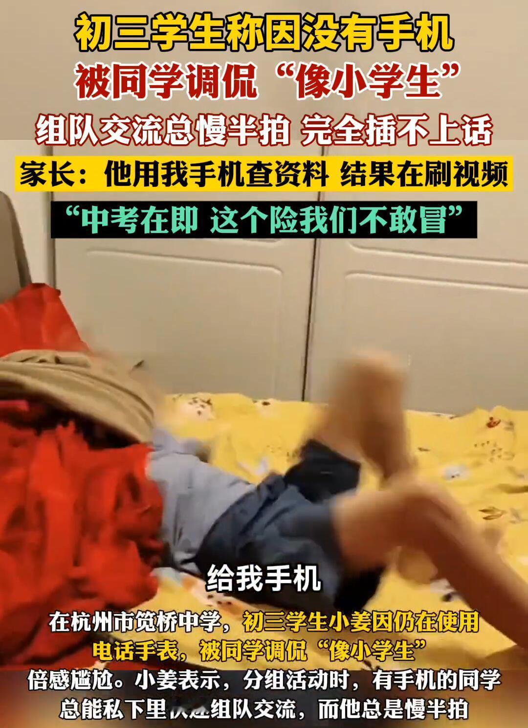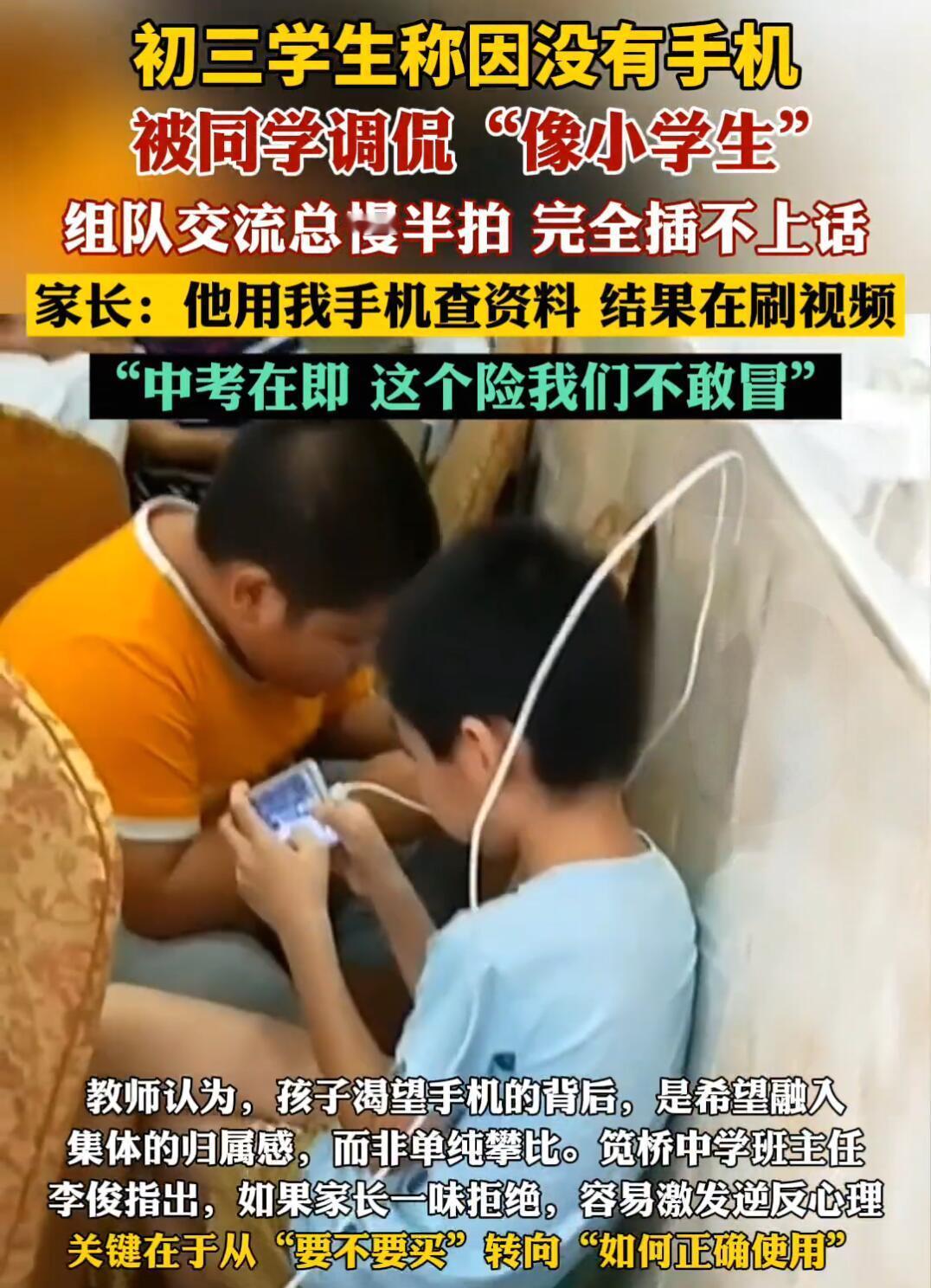 杭州一位初三同学,因为还在戴电话手表,被同学嘲笑“小学生”,心里别提多委屈了。 这事儿戳中了很多家长的痛点:不给手机,怕孩子被孤立;给了手机,又怕他沉迷,耽误学习。 班主任一句话点醒了很多人:孩子要的不是手机,而是融入集体的“门票”。 那么,到底该怎么办呢? 其实,关键不在于“要不要买”,而在于“如何用”。家长可以和孩子一起商量出一个“手机使用协议”,明确规定使用时间和场景。 比如: - 平时收,周末放:工作日手机交给家长保管,周末再给孩子限时使用。 - 固定“开”“关”机时间:比如晚上十点统一收机充电,避免熬夜。 - 用“任务制”代替“随便玩”:把使用手机当作完成学习任务后的奖励。 同时,家长也要理解孩子的感受,不要一味打压。可以引导他通过其他方式融入集体,比如一起打球、参加社团,找到除了手机之外的共同话题。 总的来说,堵不如疏。教会孩子在数字时代里自我管理,比单纯禁止更重要。 这个问题你怎么看?你家有同款“手机大战”吗?欢迎在评论区聊聊你的高招!