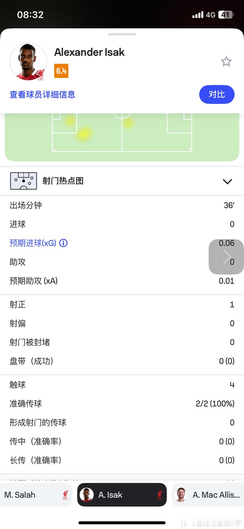 没人给伊萨克传球36分钟伊萨克4次触球2次传球准确