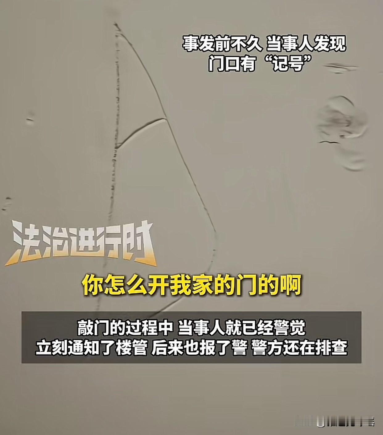 “真的细思极恐!”河南开封一女子正在家休息,突然有人先敲门,女子以为敲错了没有理会,看她没答应,一陌生男子居然直接撬锁走了进来。大白天就这么大胆,幸好小偷做贼心虚,看到屋里有人转身就跑。 回顾整个过程,我觉得最可怕的是,女生后来发现家门口早就被画了奇怪的符号。说实话,这明显是小偷团伙在踩点做记号,现在连犯罪都搞得这么有套路,真是太可怕了。 真心建议独居的朋友们,家门口一定要装个监控。要是看到可疑记号,马上擦掉并且报警。要我说,现在小偷都这么“努力”,咱们的防盗意识真得跟上趟。把社区管理和科技手段结合起来,才能不让坏人有空子可钻。毕竟安全这件事,怎么小心都不为过!