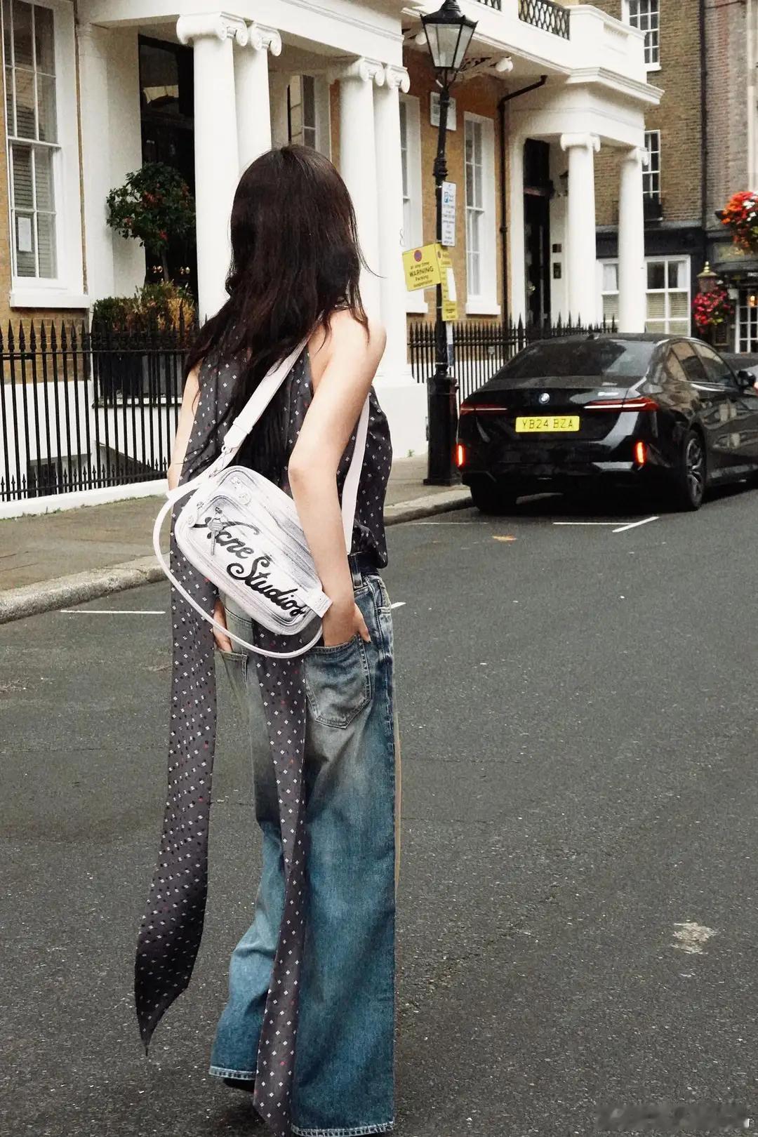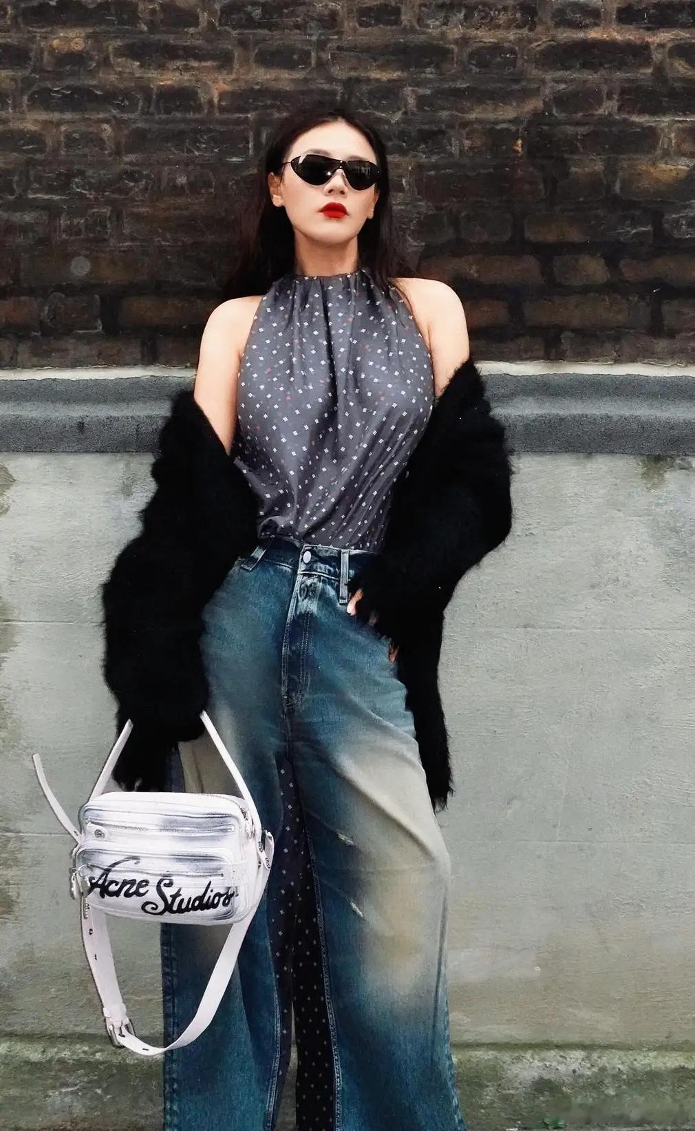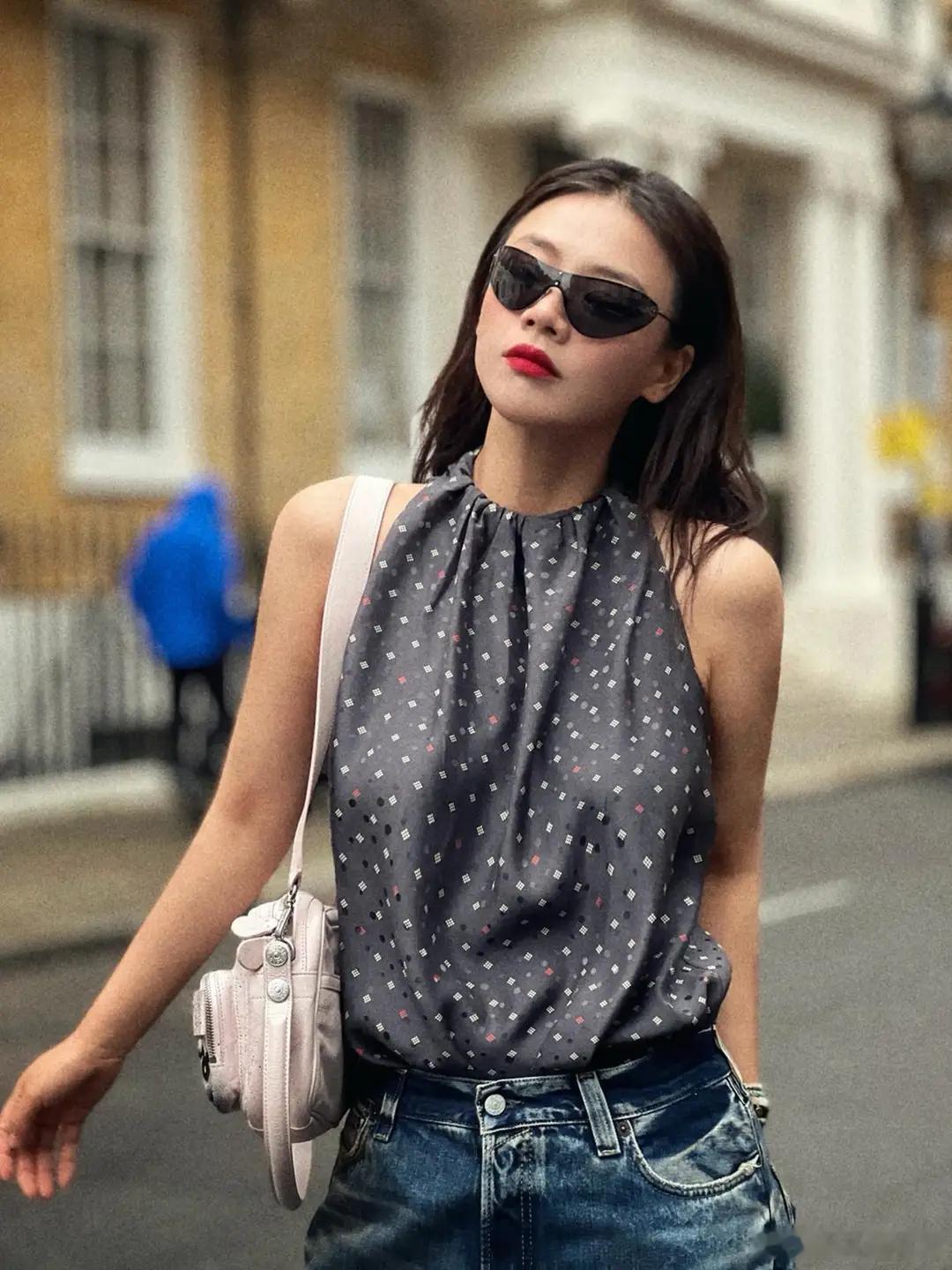 马思纯漫步巴黎,身穿黑色挂脖上衣肩膀瘦削,又瘦了不少了……