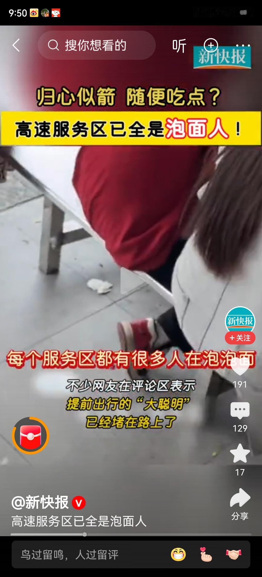 中秋国庆两节叠加, 高速上到处都是人, 这么久的长假, 再加上这么大的节, 很多在外工作的人都要回家一趟, 看看这个新快报的报道, 高速服务区的很多人都是吃方便面, 可能是之前大家堵车堵习惯了, 知道中秋国庆这样的大节人太多, 不容易买到食物, 高速服务区买吃的估计要排很长时间的队, 所以大家都先买了方便面, 在服务区吃, 这样省时又方便。