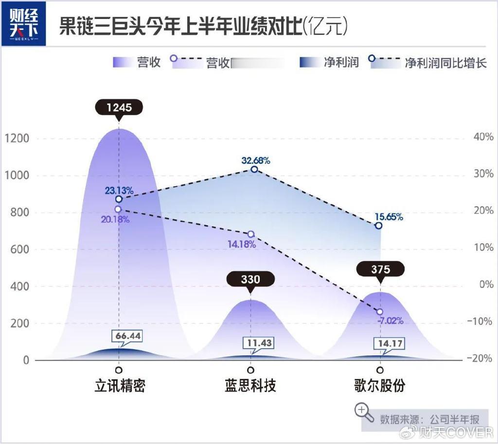 2025年上半年,立讯精密实现营业收入1245.03亿元,同比增长20.18%,净利润表现同样出色,达到66.44亿元,同比大幅增长23.13%。与歌尔股份、蓝思科技这两家果链巨头对比可以看到,立讯精密实现了断层式领先。