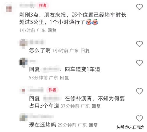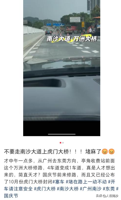 南沙国庆第一堵,不止是路堵,还有心堵!有市民反馈,国庆前一天,部分市民提前带着一家大小出行,因此道路提前塞车。但是当他们下班回到南沙的时候,在南沙重要通道南沙大道的万洲大桥上,竟然在修路。4车道变成了1车道。另外其他路段也有反馈封闭车道在给桥的护栏重新喷漆。 虽然说工作安排了是要进行的,但是真的是不知道国庆的前一天就会开始塞车吗?