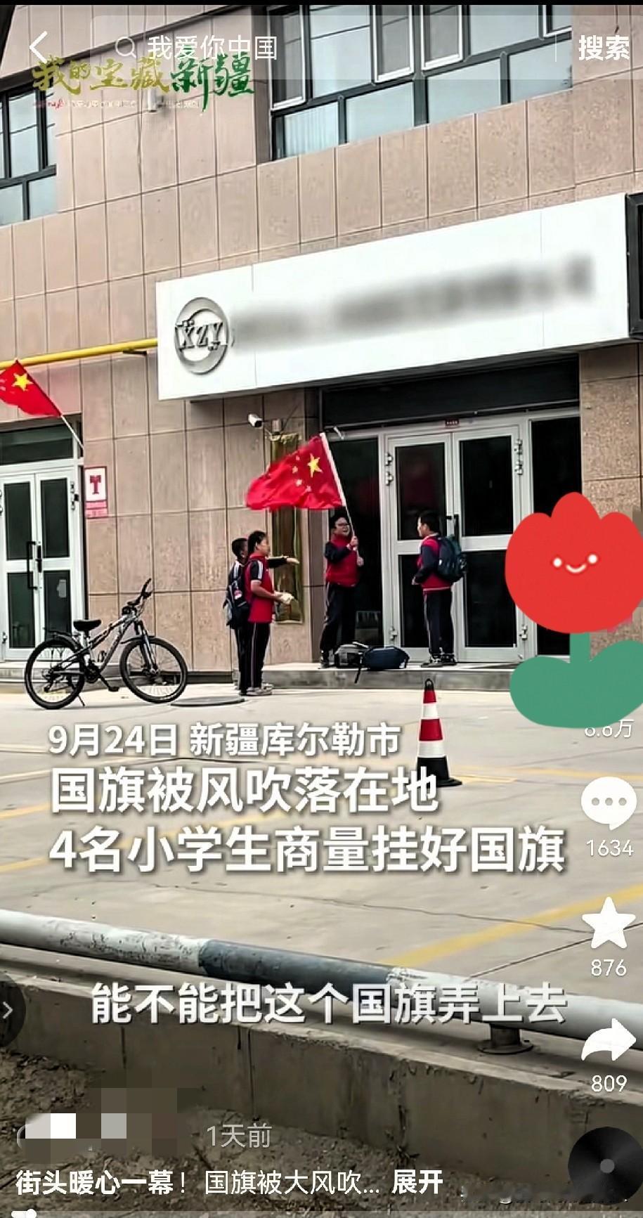 在新疆库尔勒发生了一件令人暖心的事情! 路过这家店铺时,发现店铺外的国旗掉了,四名正在放学路上的小学生看到后,马上冲上前去捡起国旗。 并且试图把国旗挂回去,但由于他们个子太小了,力气也不够,一直都挂不上去。 这时,恰好路过了一位大哥,他看到孩子们想挂国旗但挂不上去,于是就上前帮忙,把国旗重新插好! 国旗重新插好后,孩子们才放心的离开了! 看完这个视频后,网友们纷纷为这几个孩子点 赞,也为路过的大哥点 赞! 孩子们年纪虽然小,但是爱国的心却是大的!能把国旗拾起来挂回去,不让国旗在地上蒙尘,已经说明他们的爱国之心了! 更何况,他们还是一群小学生呢!路过的大哥也很暖心,看到孩子们挂不上去国旗,就主动上前帮忙,把国旗插好! 真的是小事不出,大事出征! 这个视频里的事情虽然很小,但是却能体现出浓浓的爱国情! 比起那些喊口号的爱国,做起来更能体现爱国情怀! 很多网友也都表示,这种小事更能体现爱国情,不像有些人喊口号的爱国,真的是爱国的话,应该从点滴做起! 很多网友也都说,这就是爱国教育吧,在学校里,老师经常会给学生讲一些爱国故事吧,让学生们都记住这面国旗,让学生们都爱护这面国旗! 比起空喊口号,捡旗挂旗的小事更有力量。它证明爱国不用宏大叙事,守住身边的国旗,就是真爱国。 大家对于这件事情的评论也都很正能量,都夸孩子们有爱国精神,都夸大哥热心肠,更夸新疆的爱国教育做得好。 学校里经常给学生们讲爱国故事,让孩子们都爱护这面国旗,不让这面国旗在地上蒙尘,不让这面国旗被别人坏坏地对待! 爱护国旗人人有责,大家平时怎么做?