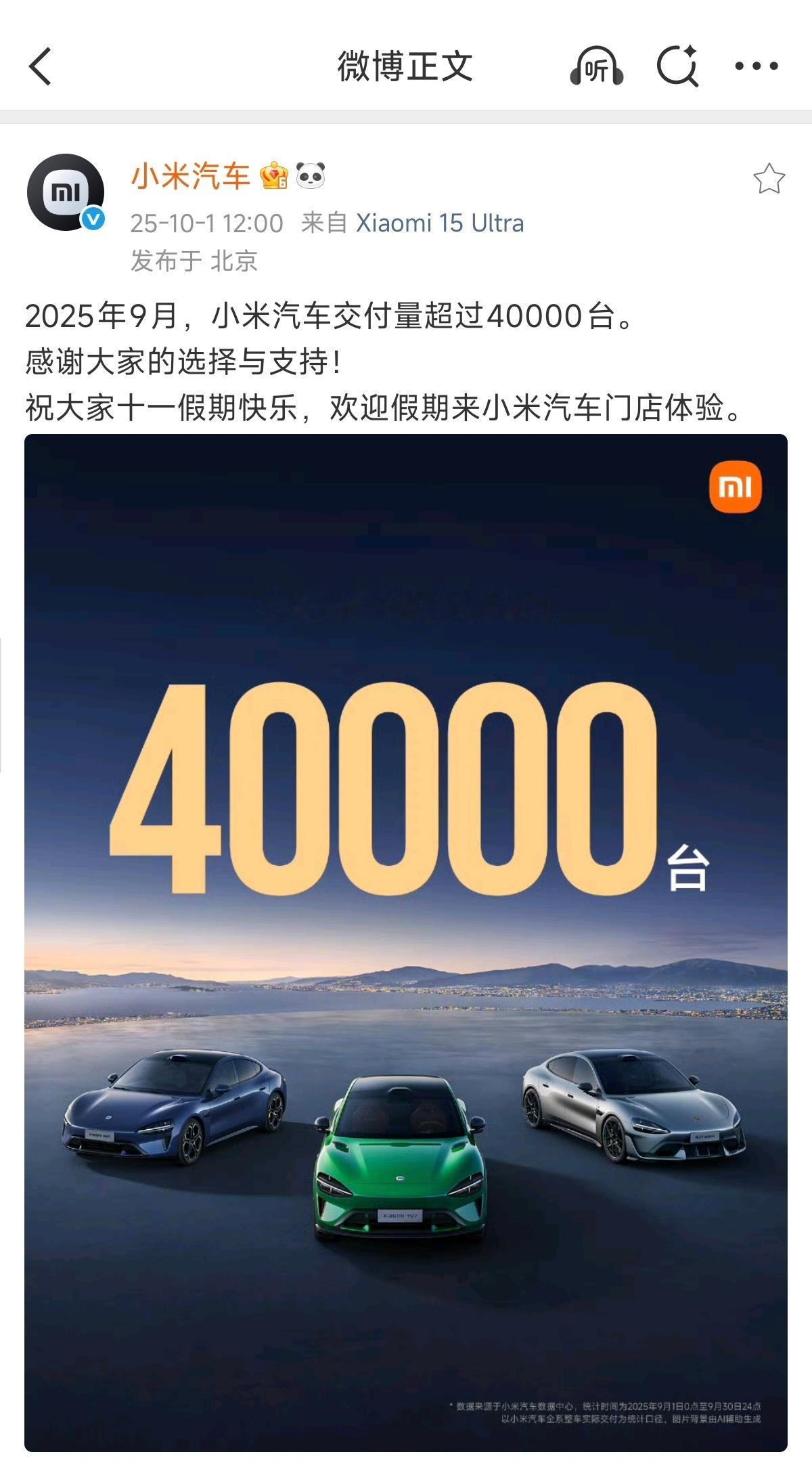 小米汽车交付量超40000台,新里程碑又达成了!10月会不会超6W?[doge]